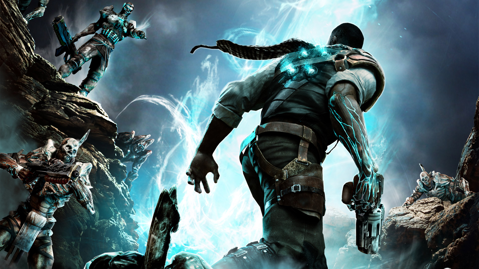 Description: A man in a futuristic suit walking through a cave with other men in the background and a demon in the foreground.