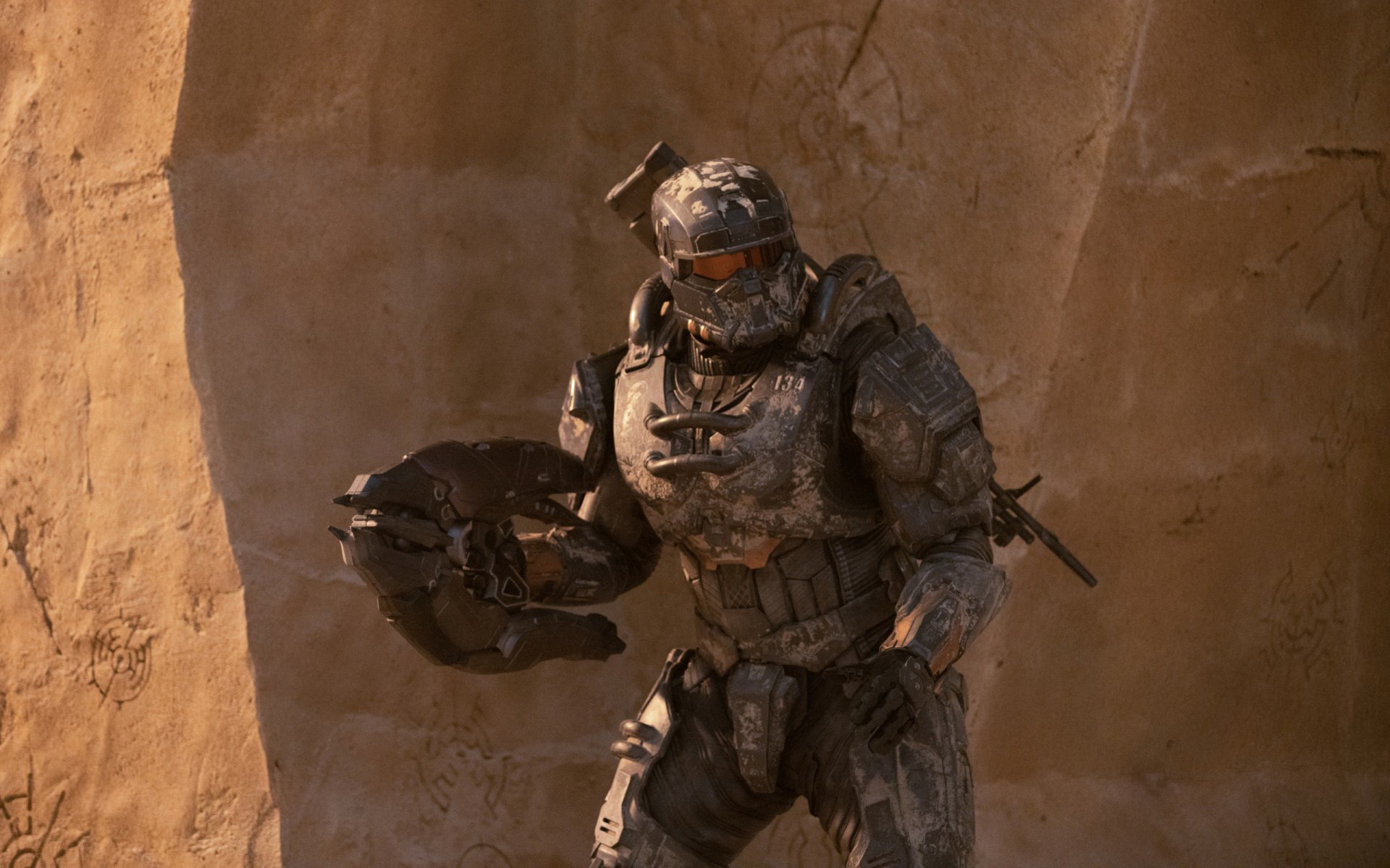 Description: A man in a futuristic suit holding a helmet and glove in front of a rock wall with a helmet on.