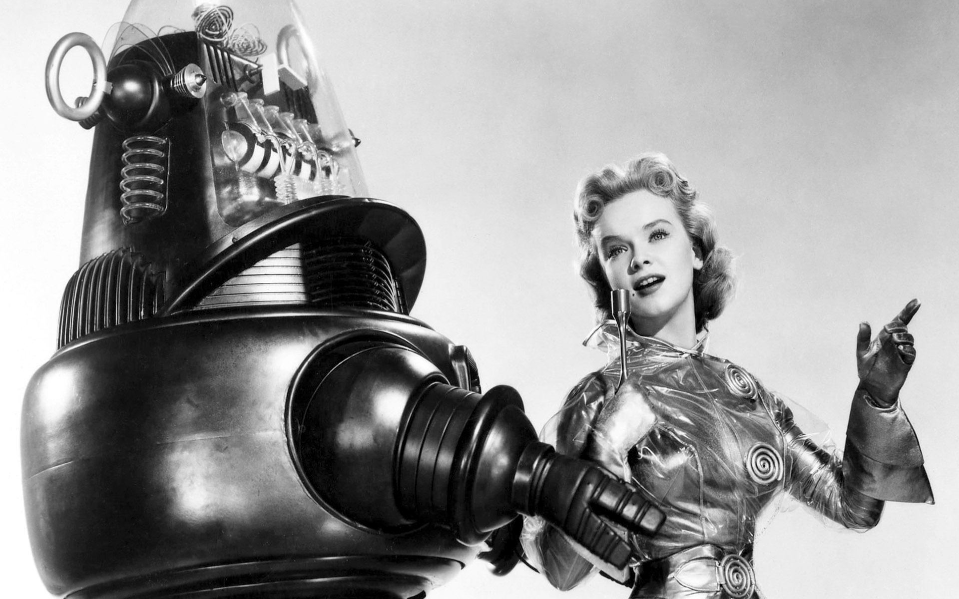 Description: A woman in a futuristic suit holding a robot's arm and pointing at it with a hand on her hip.