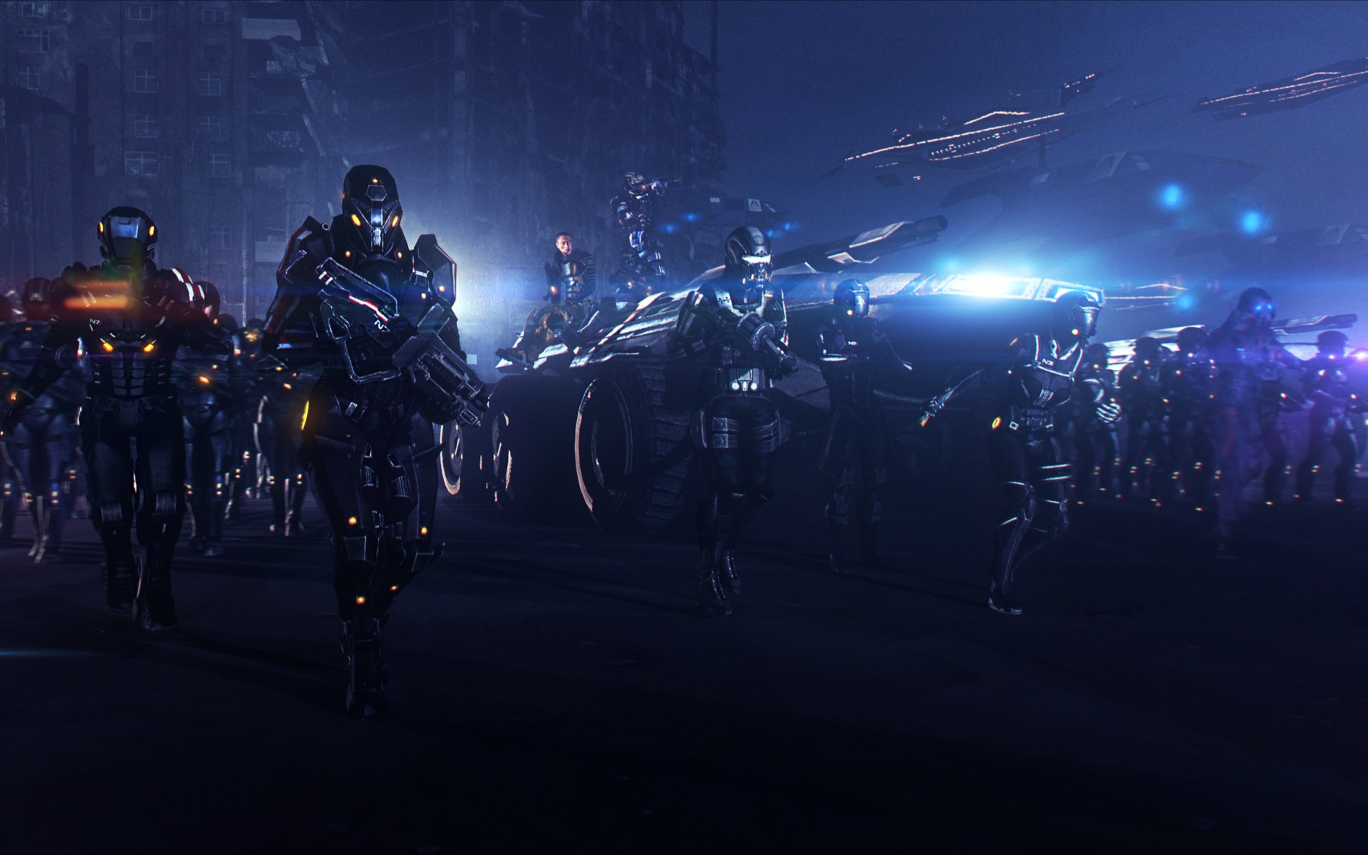Description: A group of people in futuristic suits walking down a street at night with lights on their backs and arms.