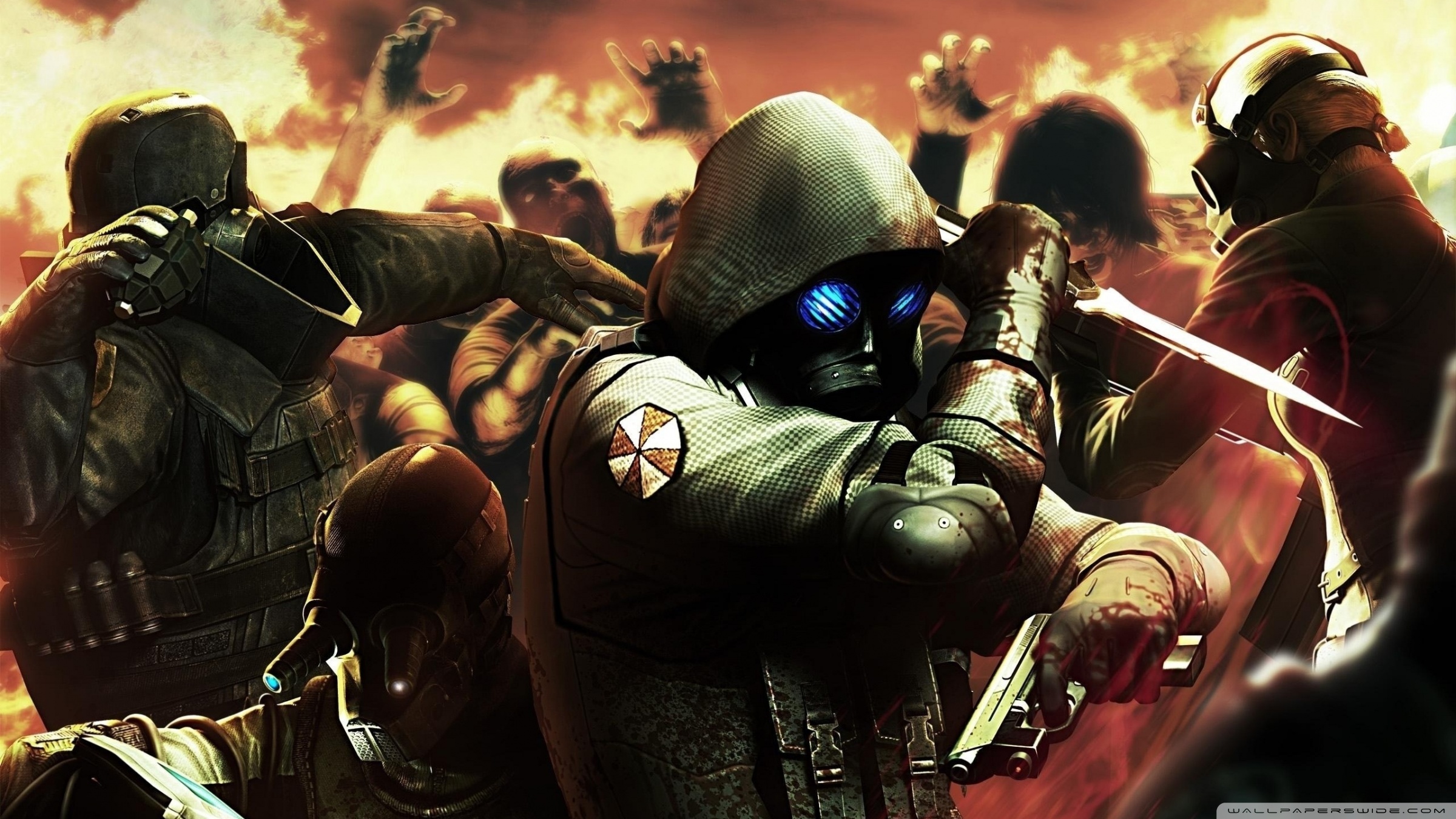 Description: A group of people in futuristic suits with swords in front of a fire filled sky with smoke and flames.