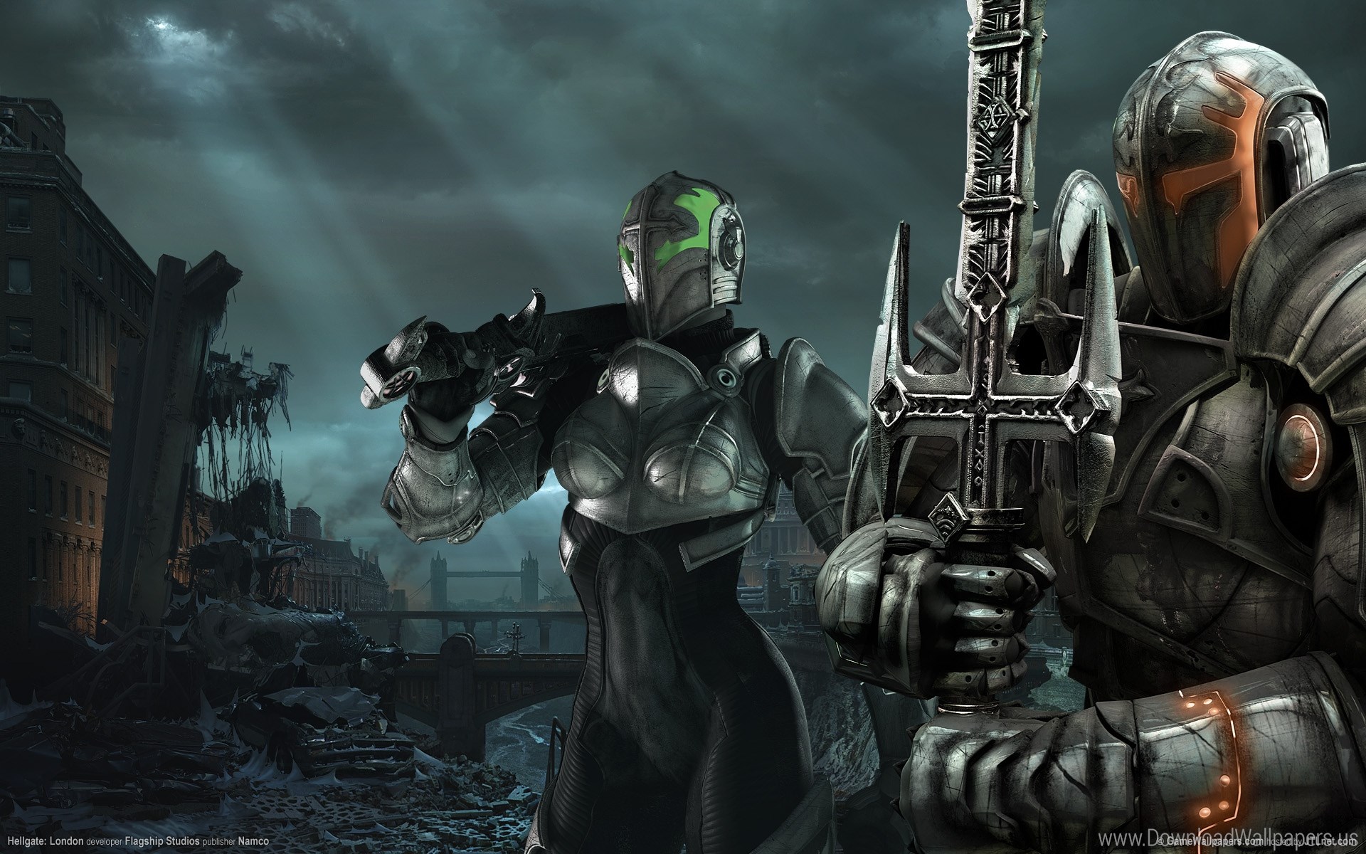 Description: Two people in futuristic suits holding a weapon in a city at night with a dark sky in the background.
