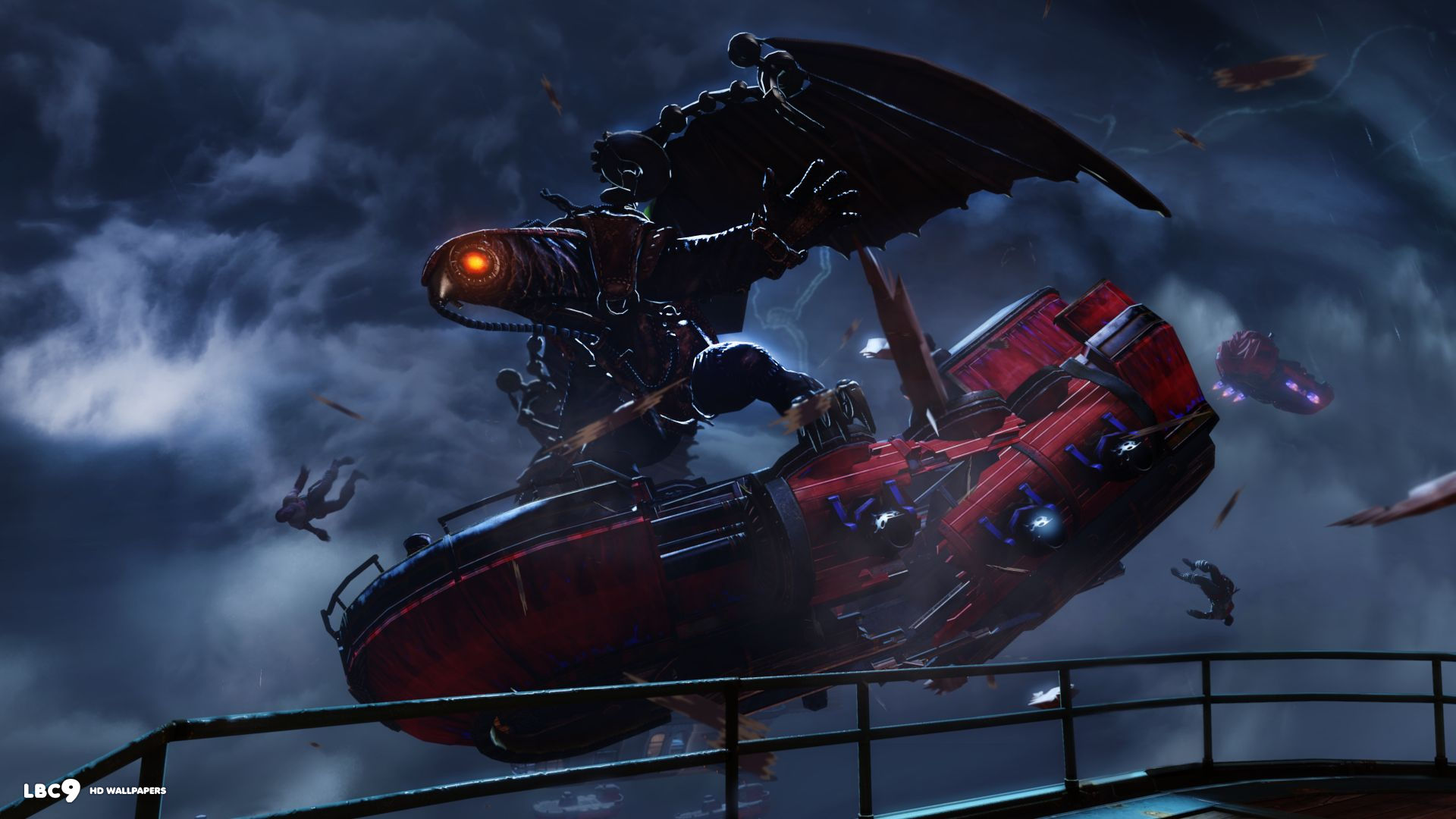 Description: A futuristic vehicle flying through the air with a giant creature on top of it's head in a cloudy sky.