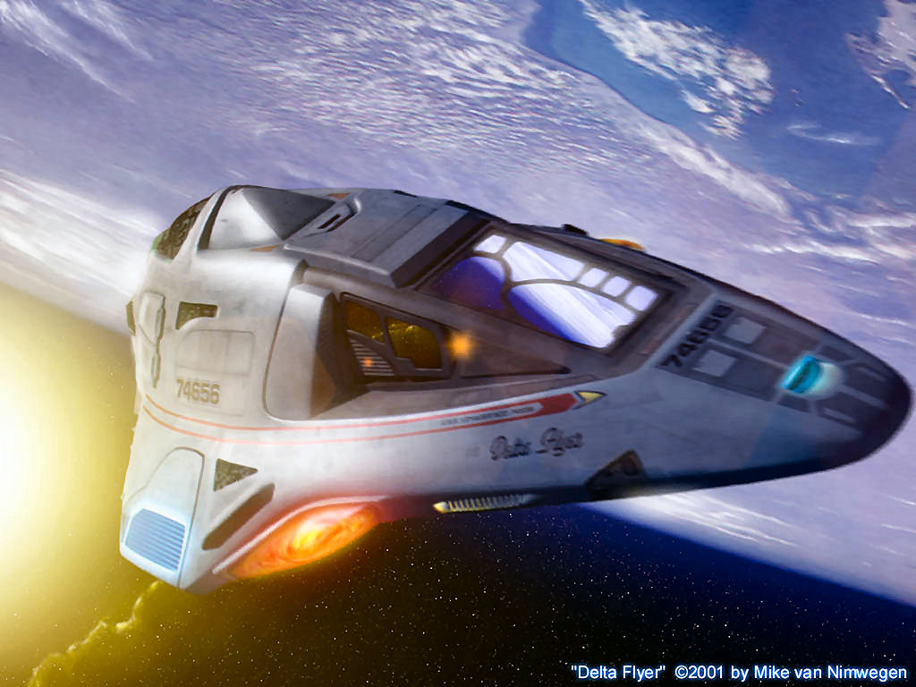 Description: A futuristic vehicle flying through the sky with a bright light on its side and a bright light on its side.
