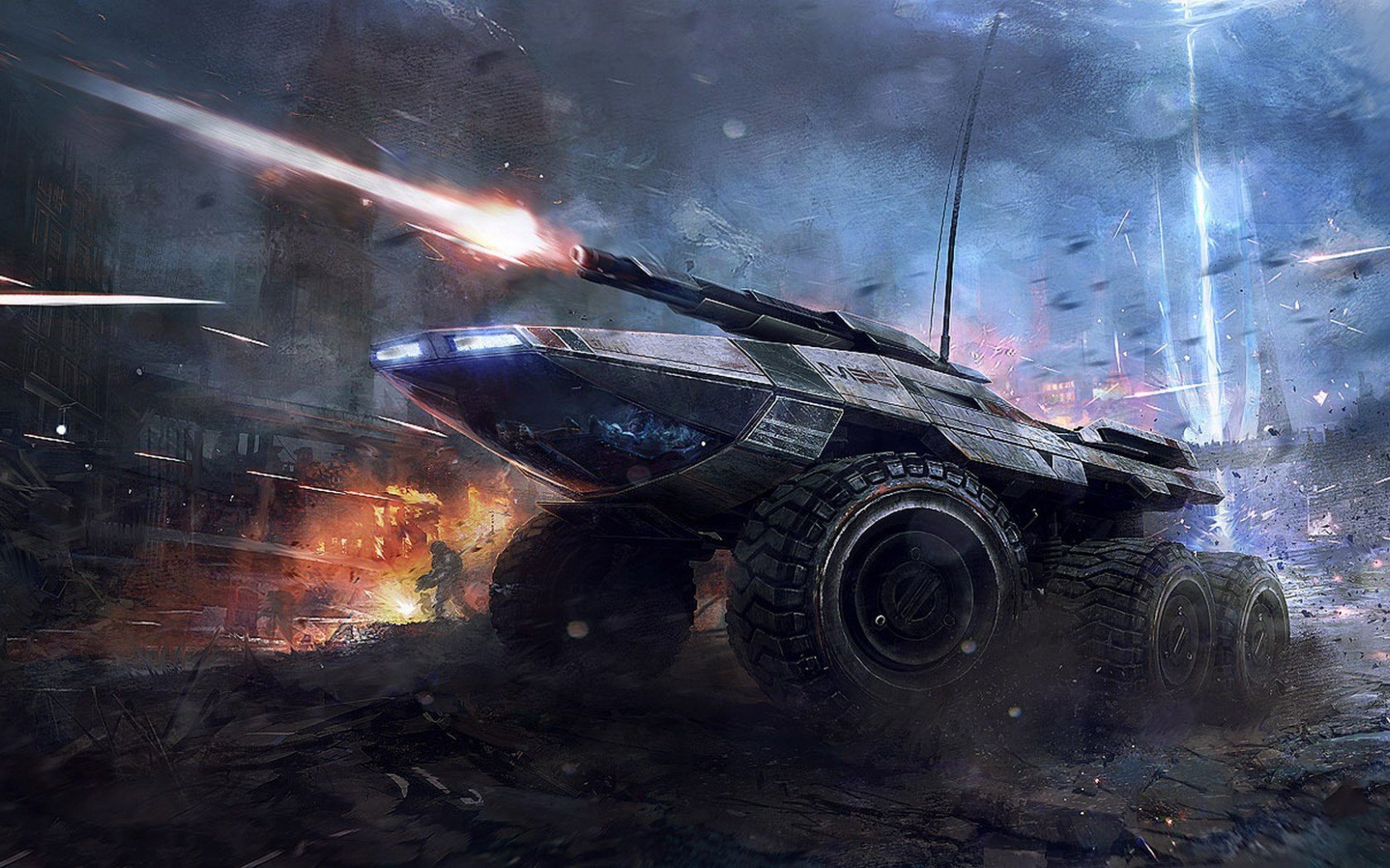 Description: A futuristic vehicle with a rocket coming out of it's back end and a rocket coming out of it's back end.