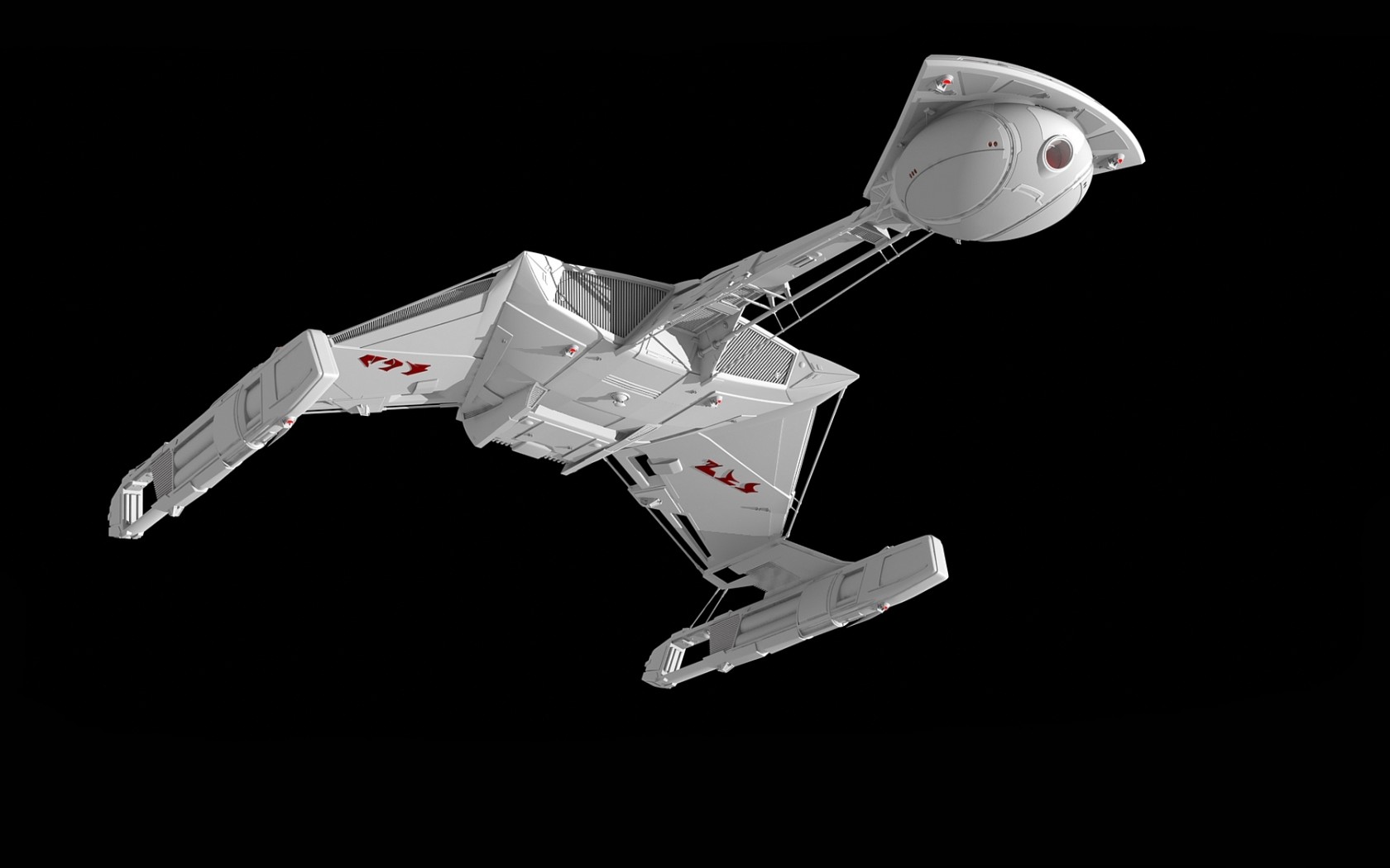 Description: A futuristic white fighter jet flying through the air with a black background and a red light on the wing.