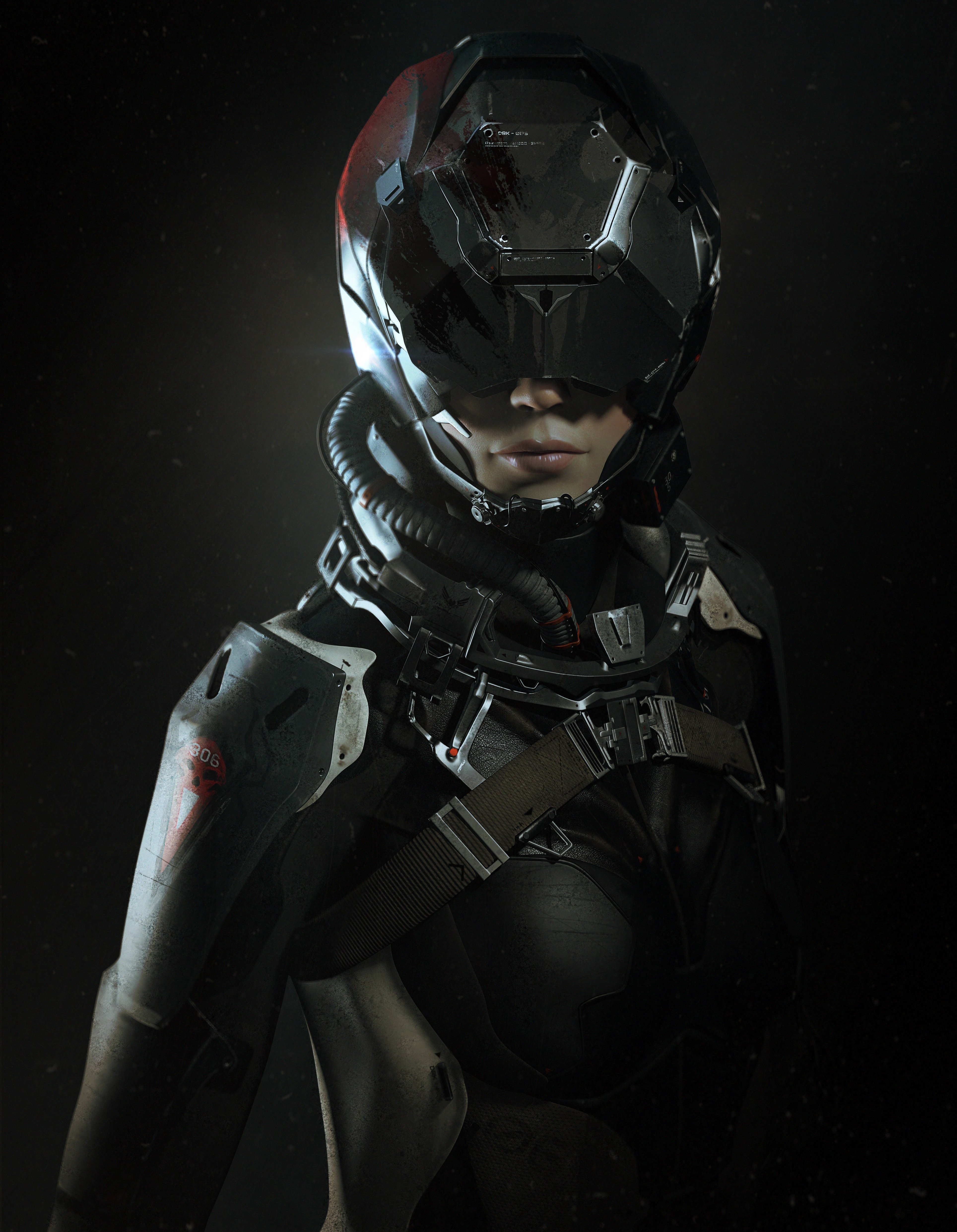Description: A woman in a futuristic suit with a helmet and goggles on her head and a sci - fi eye patch on her face.