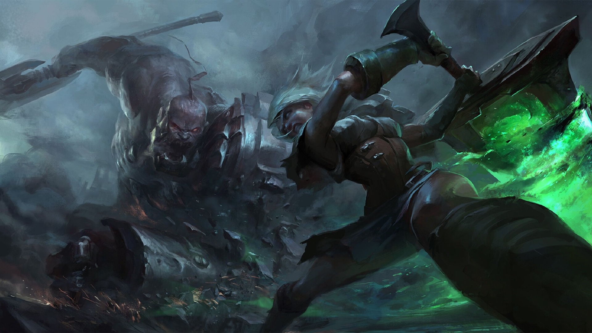 Description: A woman in a futuristic suit holding a giant axe in a dark forest with a demon in the background.