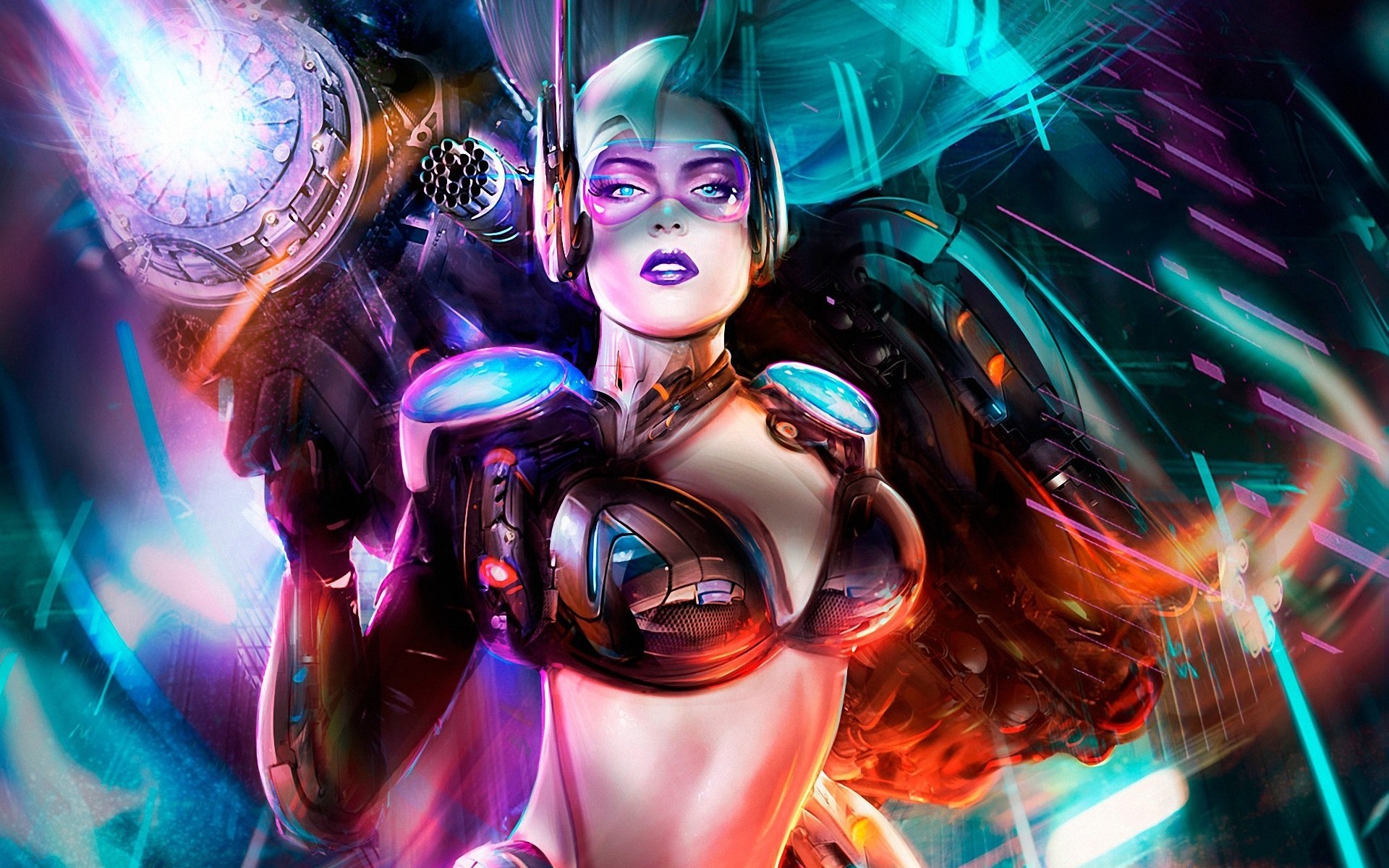 Description: A woman in a futuristic suit holding a clock and a sci - fidgetr in her hand.
