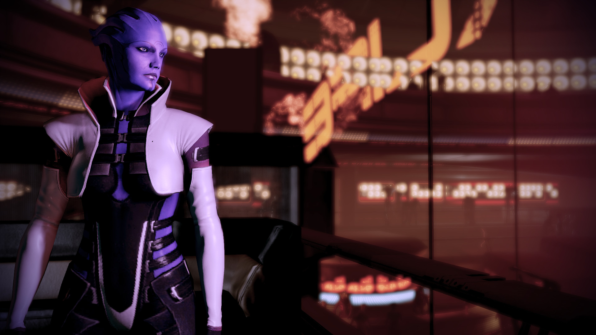 Description: A woman in a futuristic outfit standing in a room with a large screen behind her and a neon light behind her.