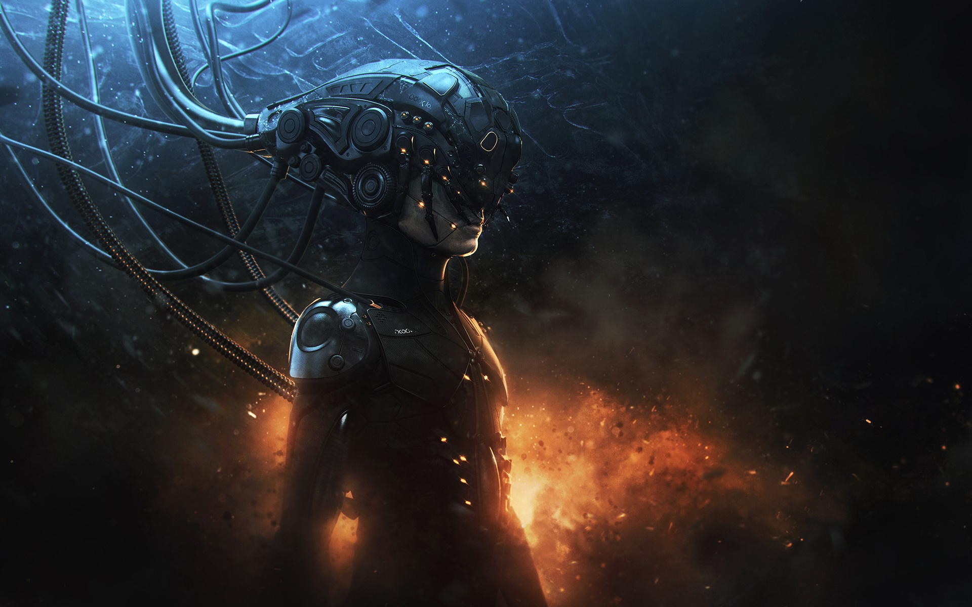 Description: A woman in a futuristic suit with a large octopus head on her head and a chain around her neck.
