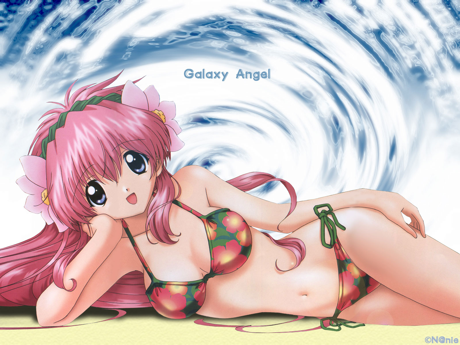 Description: A cartoon picture of a girl in a bikini laying on the beach with a wave in the background and the caption galaxy angel.