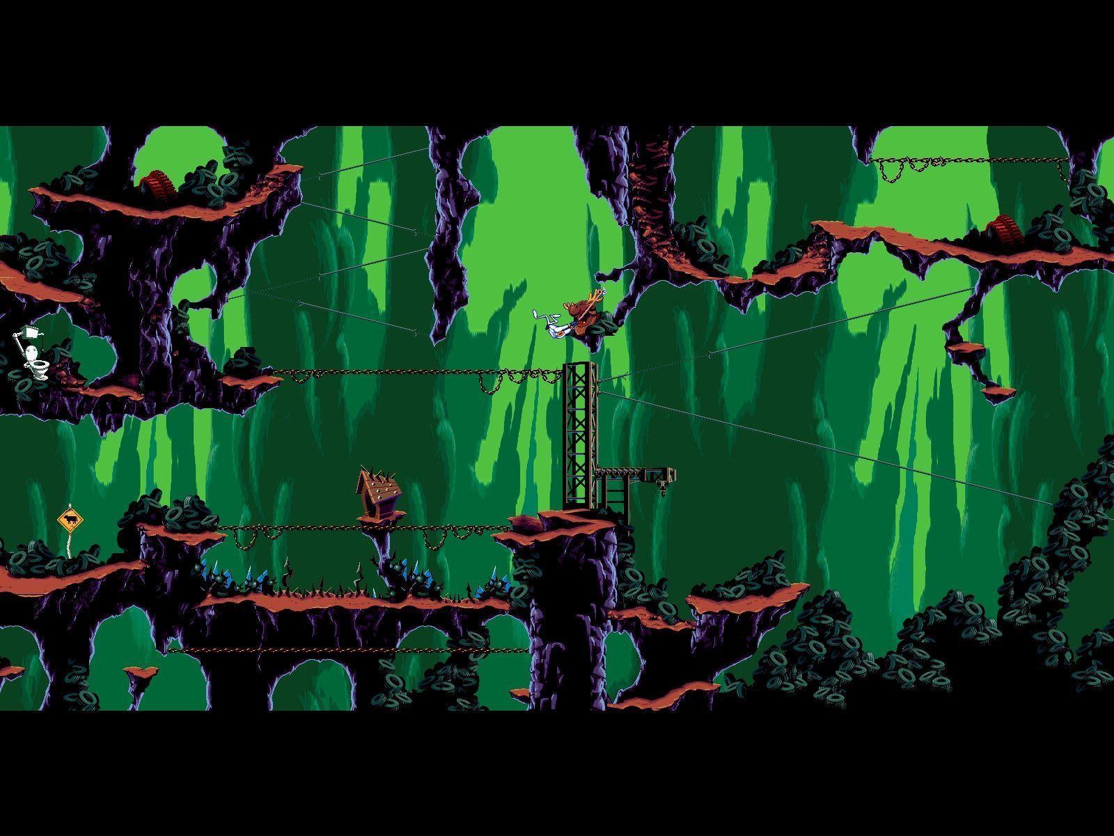 Description: A game screen with a green and black background and a red and black background with a tower and a green forest.