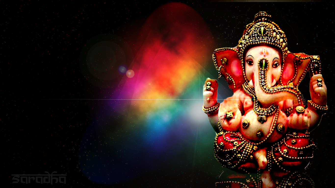 Description: A statue of a ganeshi with a rainbow background and a black background with a rainbow light in the background.