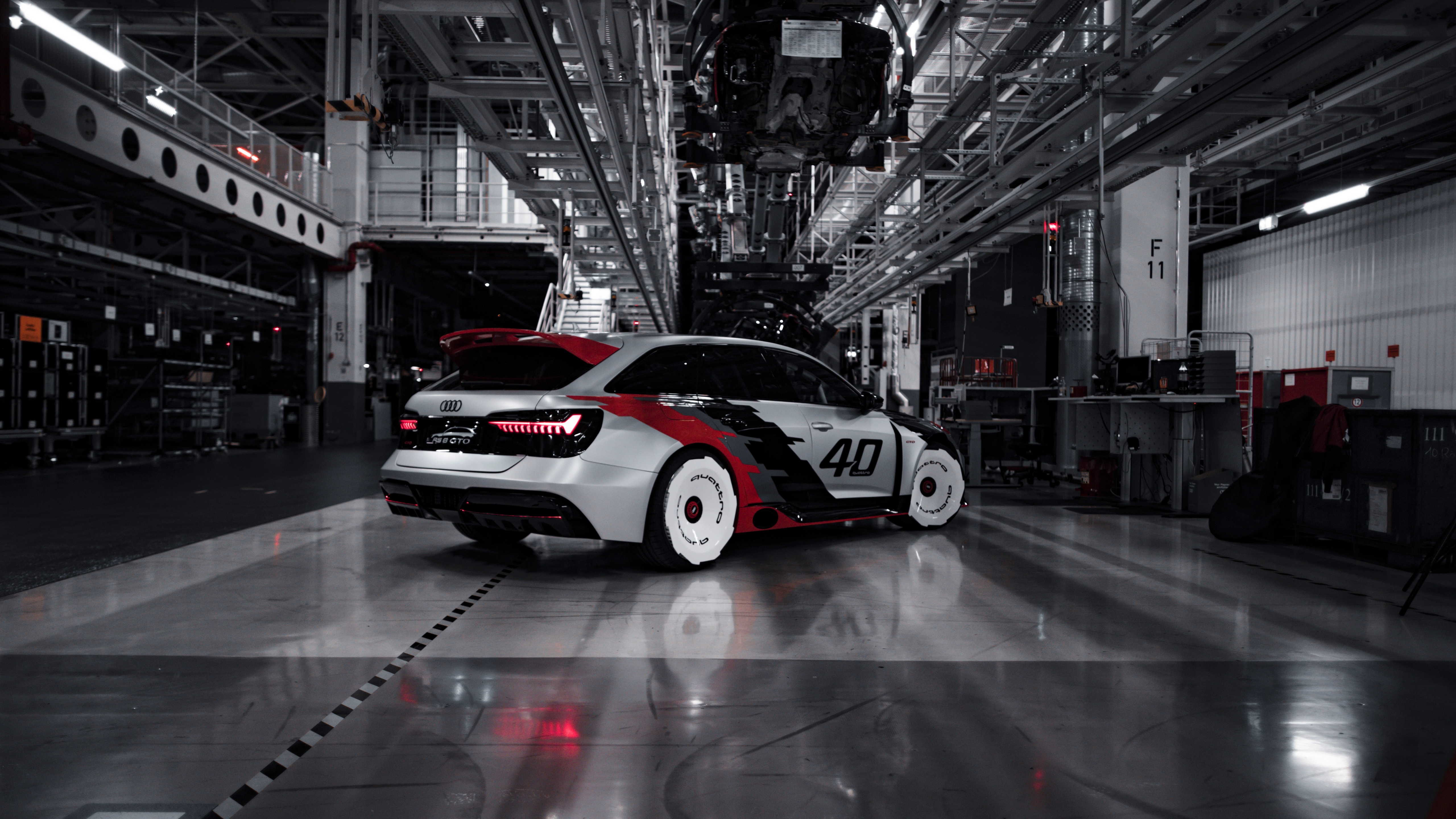 Description: A car with a number on it parked in a garage with a lot of wires hanging from the ceiling.