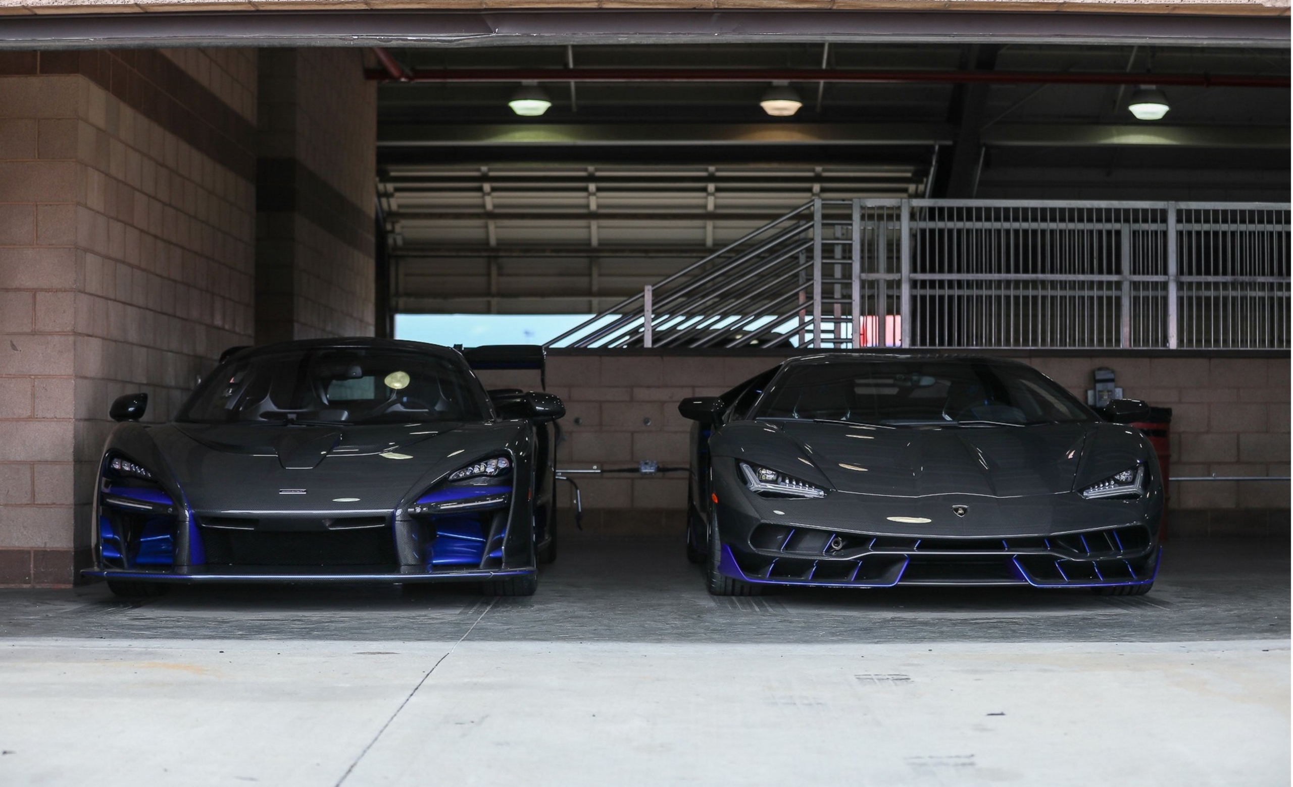 Description: Two cars parked in a garage with a staircase in the background and a man standing next to them in front of them.