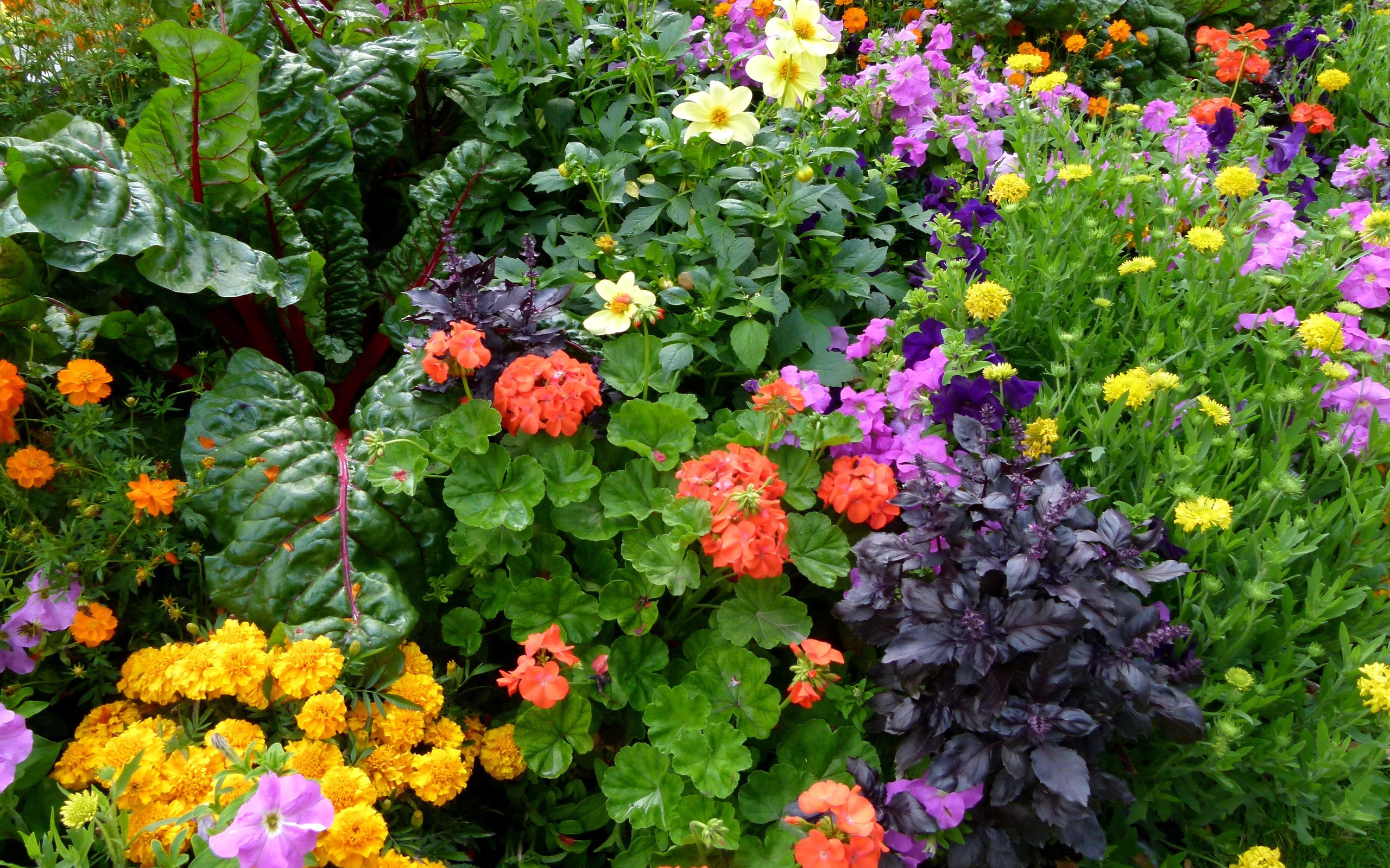 Description: A garden filled with lots of different colored flowers and plants next to each other and a green leafy plant.
