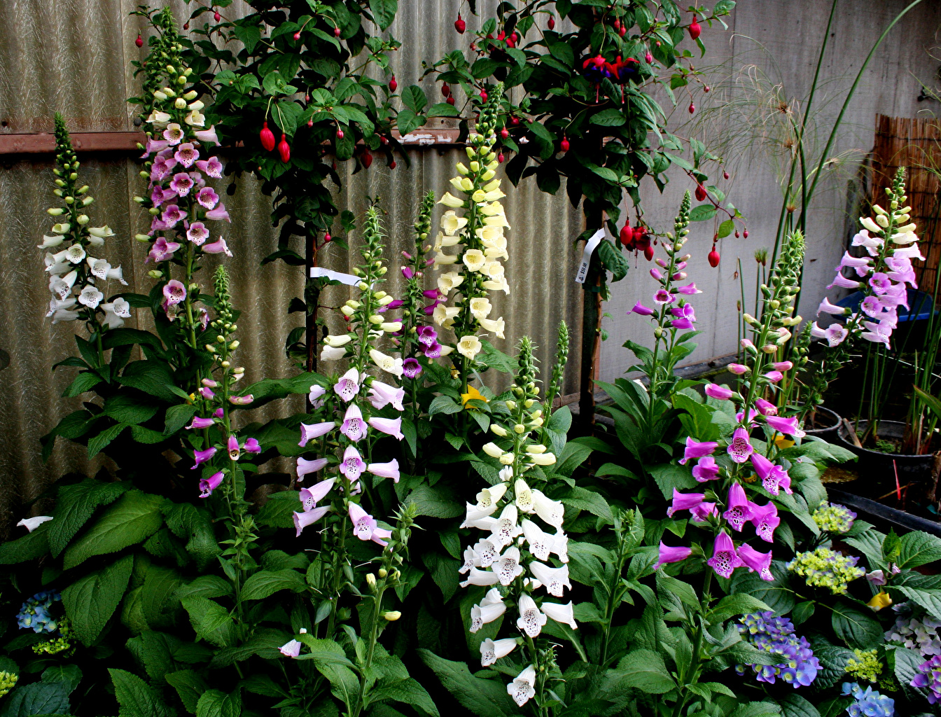 Description: A garden with flowers and plants growing on it's sides and a fence in the background with a building in the background.
