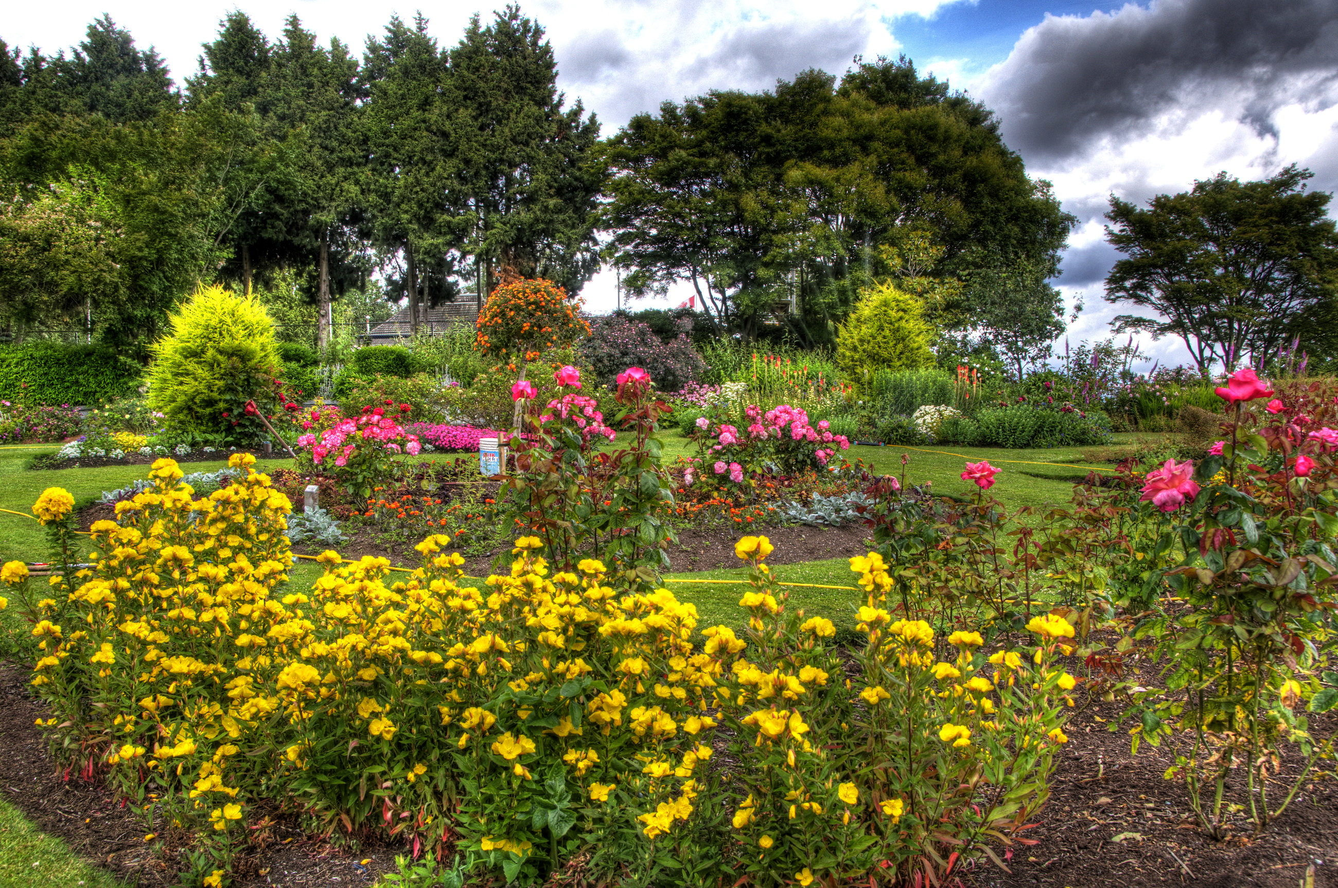 Description: A garden with a lot of flowers and trees in the background and a cloudy sky above it.