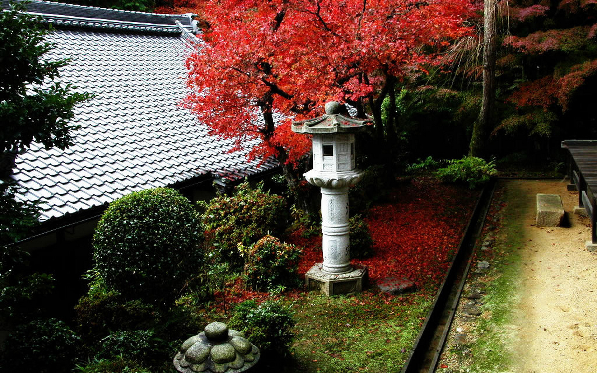 Description: A small garden with a pagoda and a tree with red leaves in the background and a bench in the foreground.
