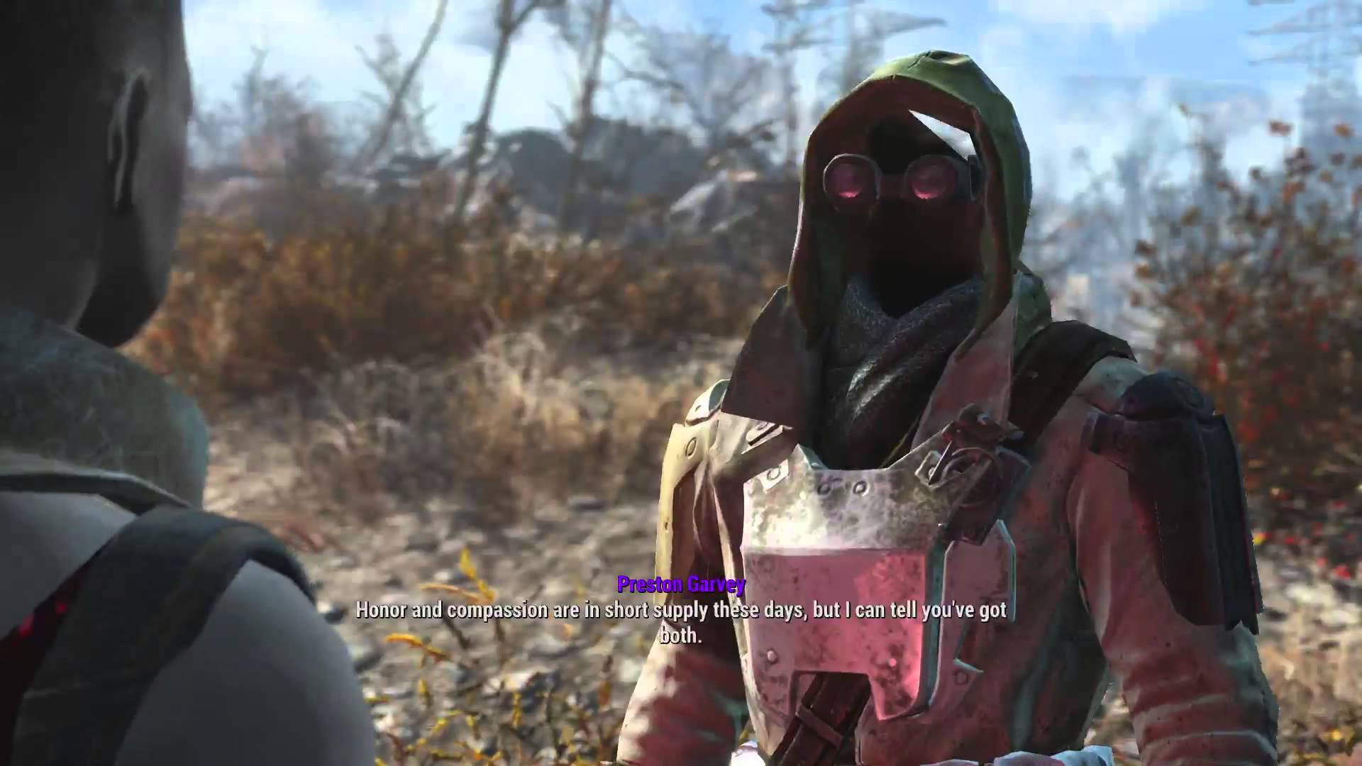 Description: A man in a gas mask standing next to a man in a red jacket and a pink hoodie.