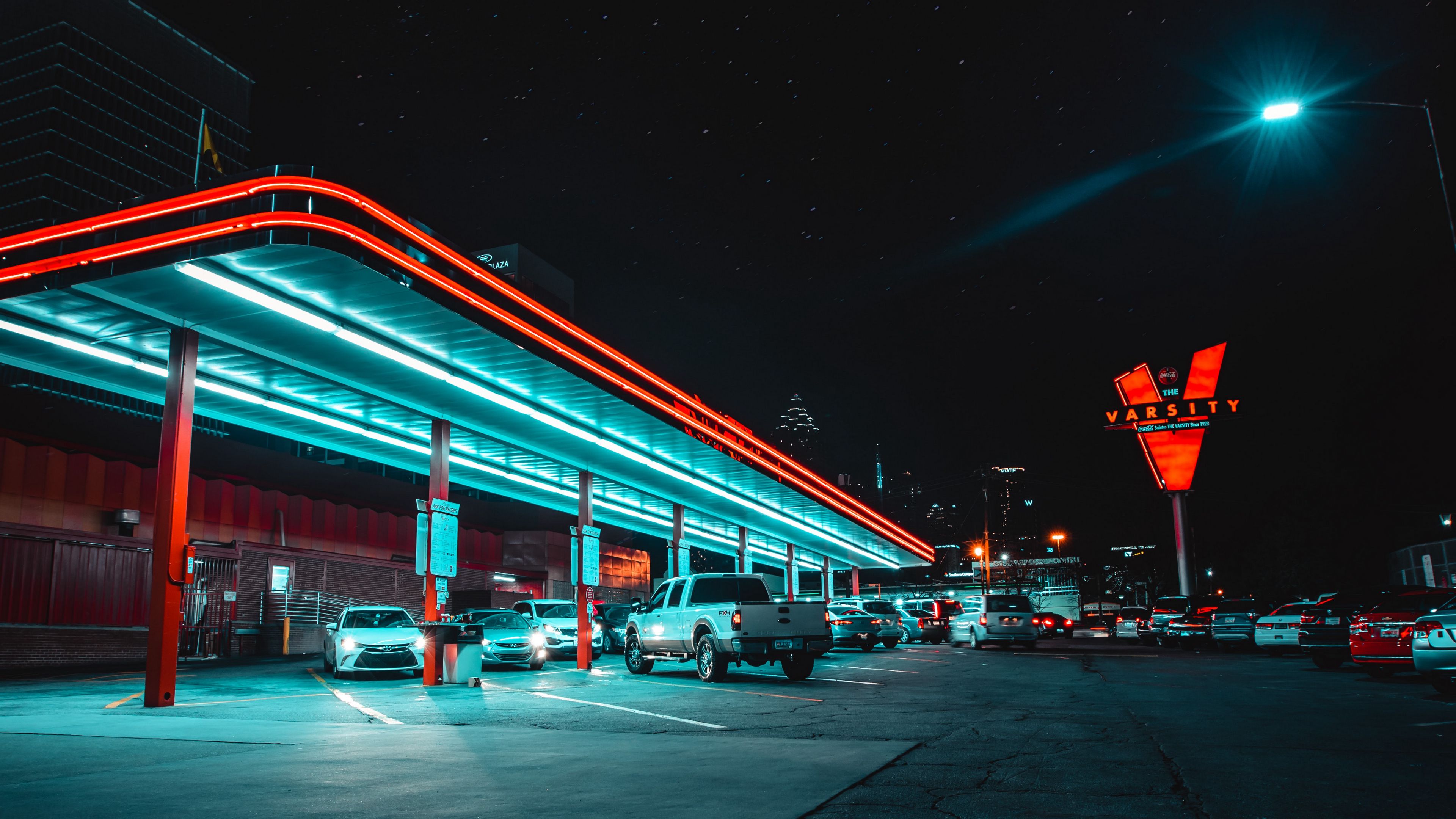 Description: A gas station with a lot of cars parked in front of it at night time with neon lights on the side of the building.