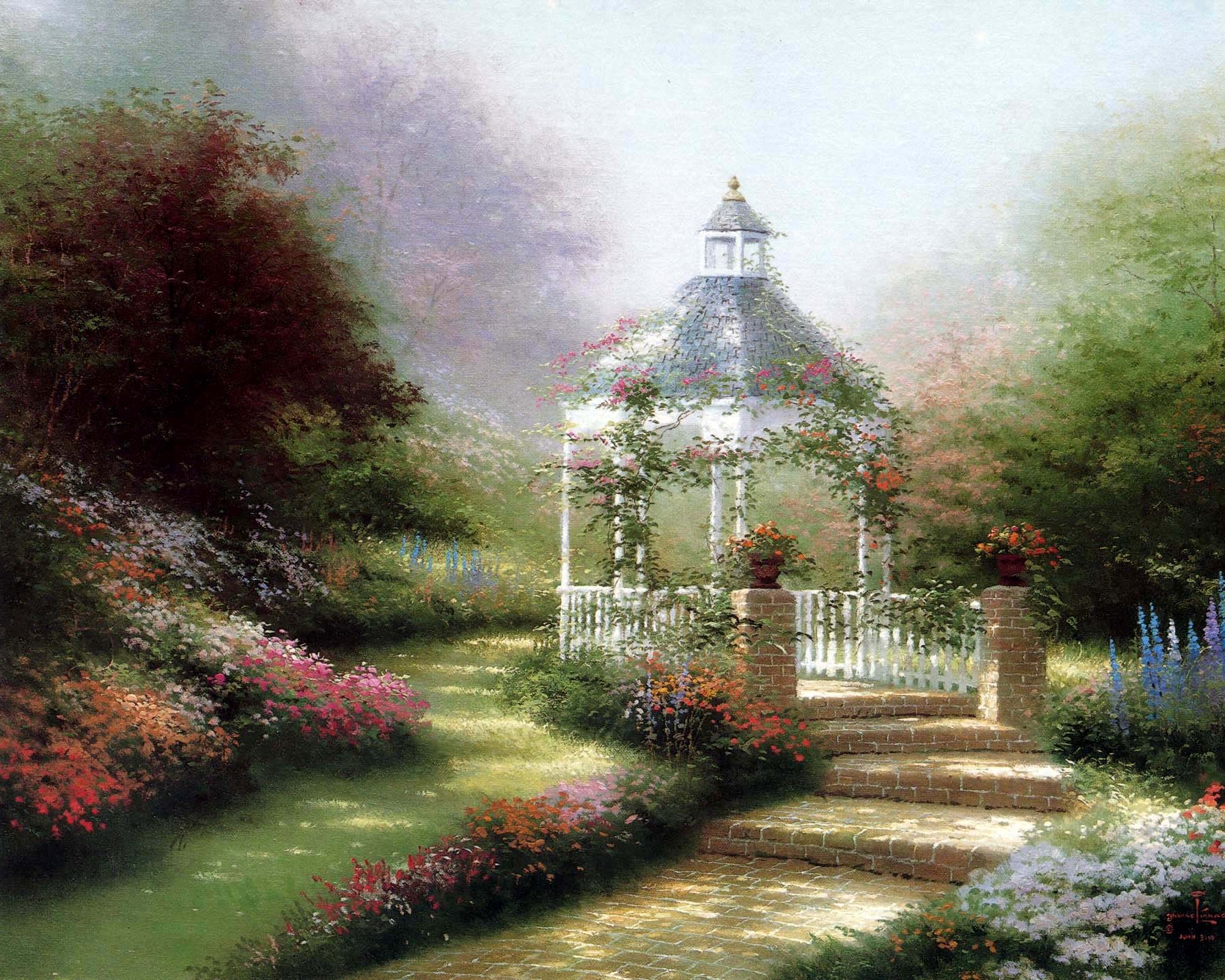 Description: A painting of a gazebo in a garden with flowers and trees around it and a path leading to it.
