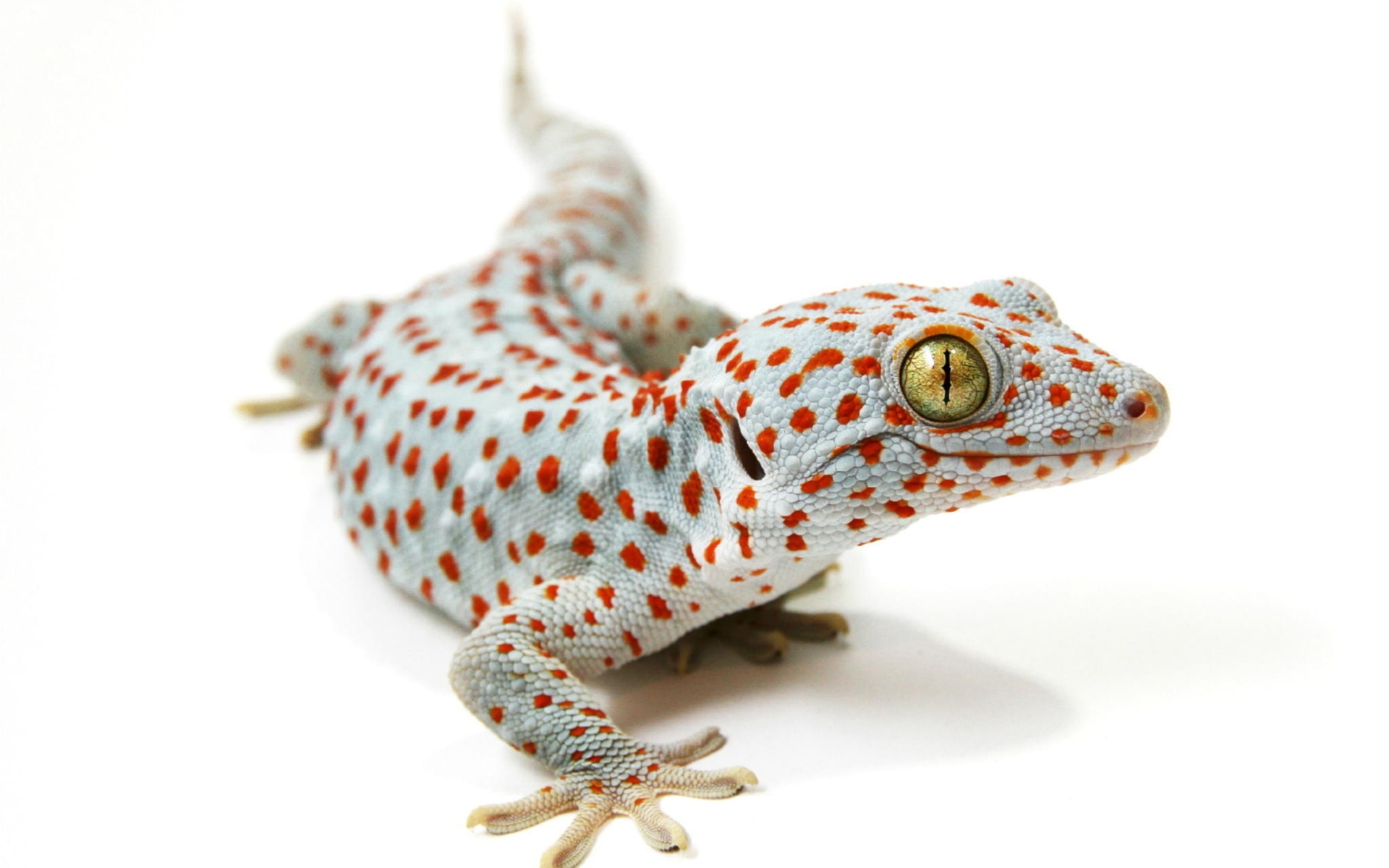 Description: A gecko is sitting on a white surface with red spots on it's body and legs.