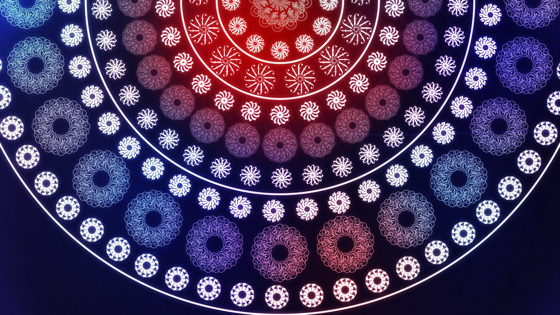 Description: A circular pattern with a red center surrounded by smaller circles of blue and red colors on a black background.