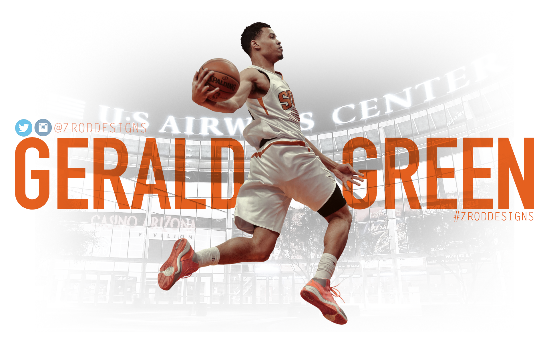 Description: A man is running with a basketball in his hand and the words gerald green above him are also orange and white.