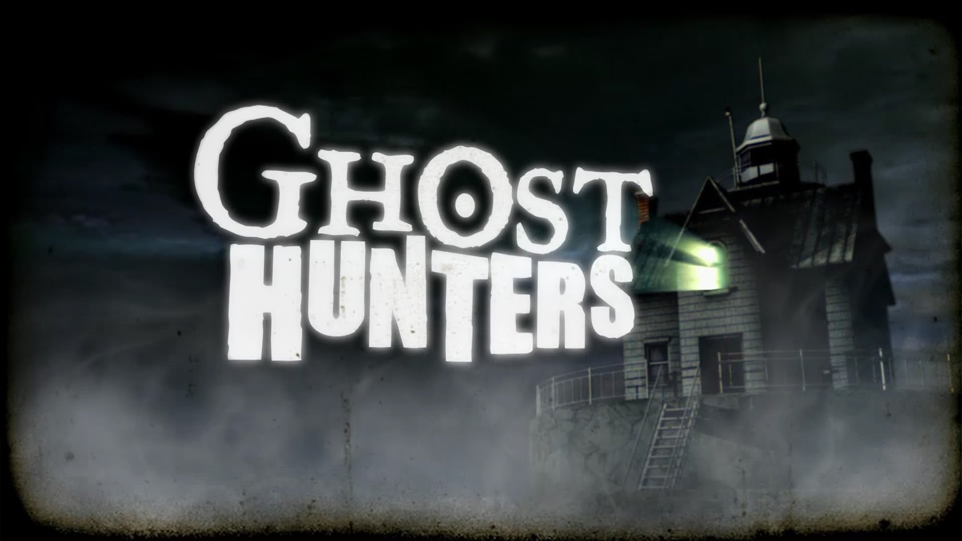 Description: A ghost hunter logo with a creepy house in the background and fog in the foreground with the words ghost hunters.