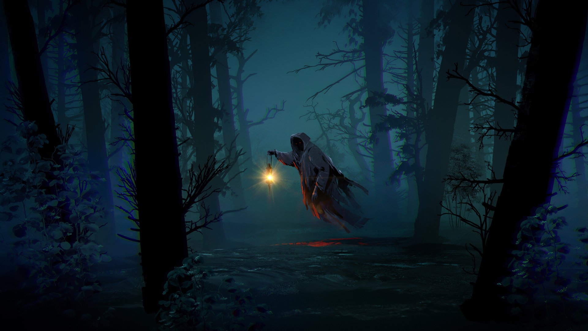 Description: A ghostly figure holding a lantern in a dark forest at night with a light shining through the trees on a foggy night.