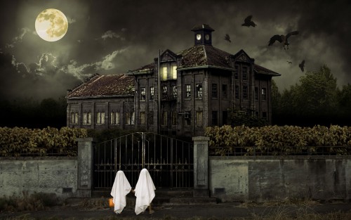 Description: Two ghost figures are standing in front of a creepy house with bats flying overhead and a full moon in the sky.