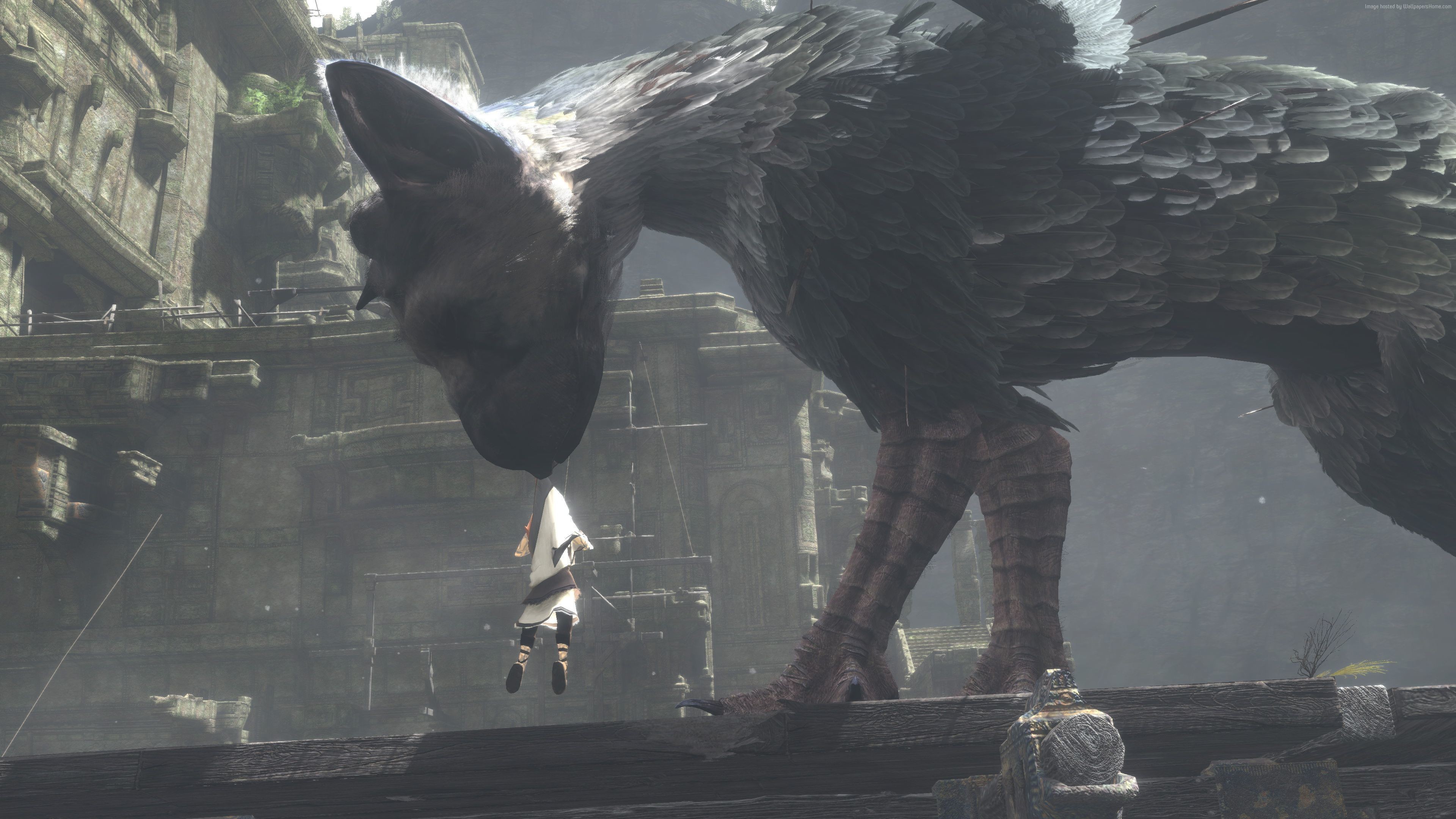 Description: A giant bird standing on top of a wooden fence next to a building in a city with tall buildings.