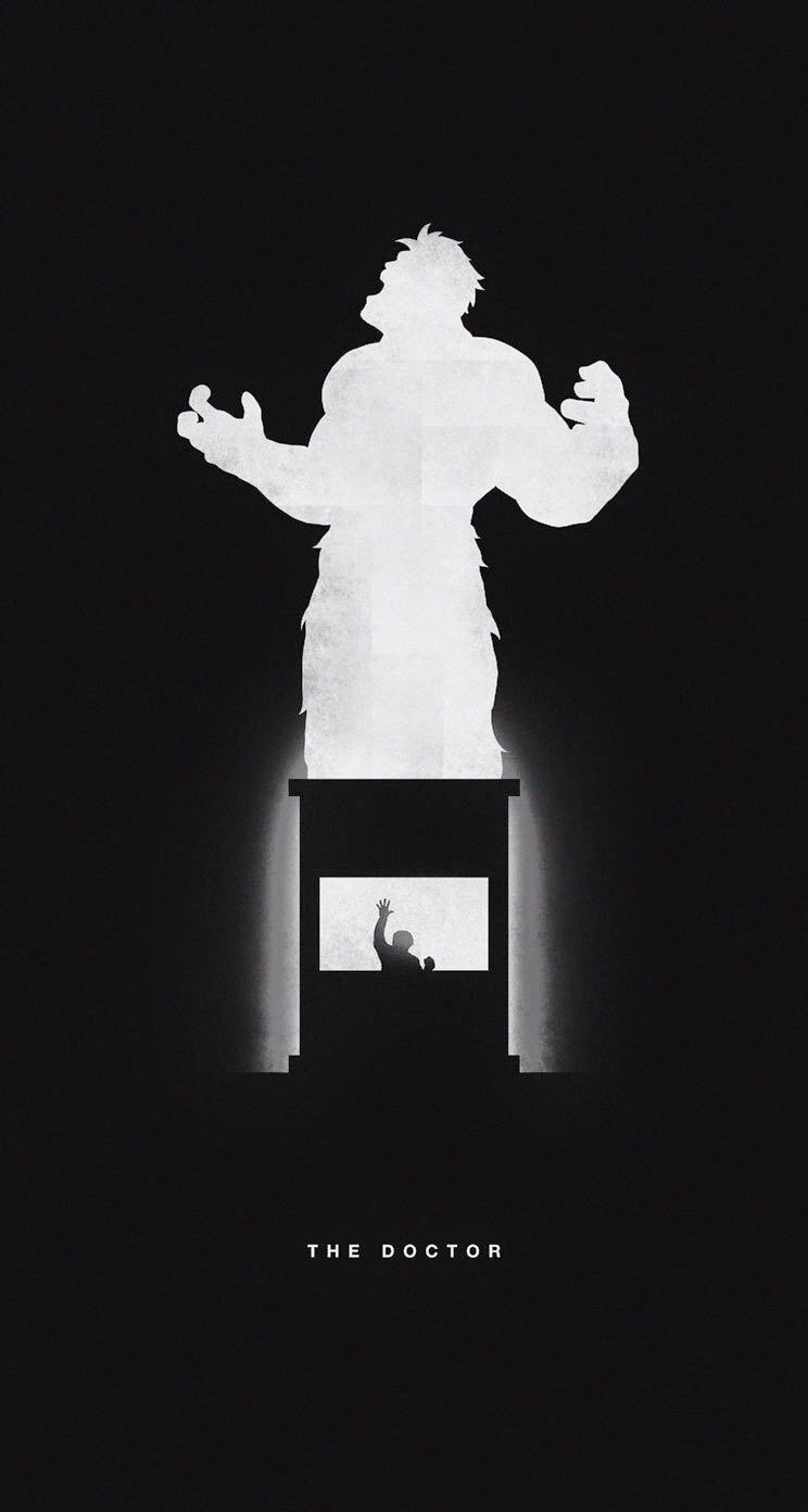 Description: A poster of a giant man sitting on a chair with a light shining on him and a person standing in the doorway.