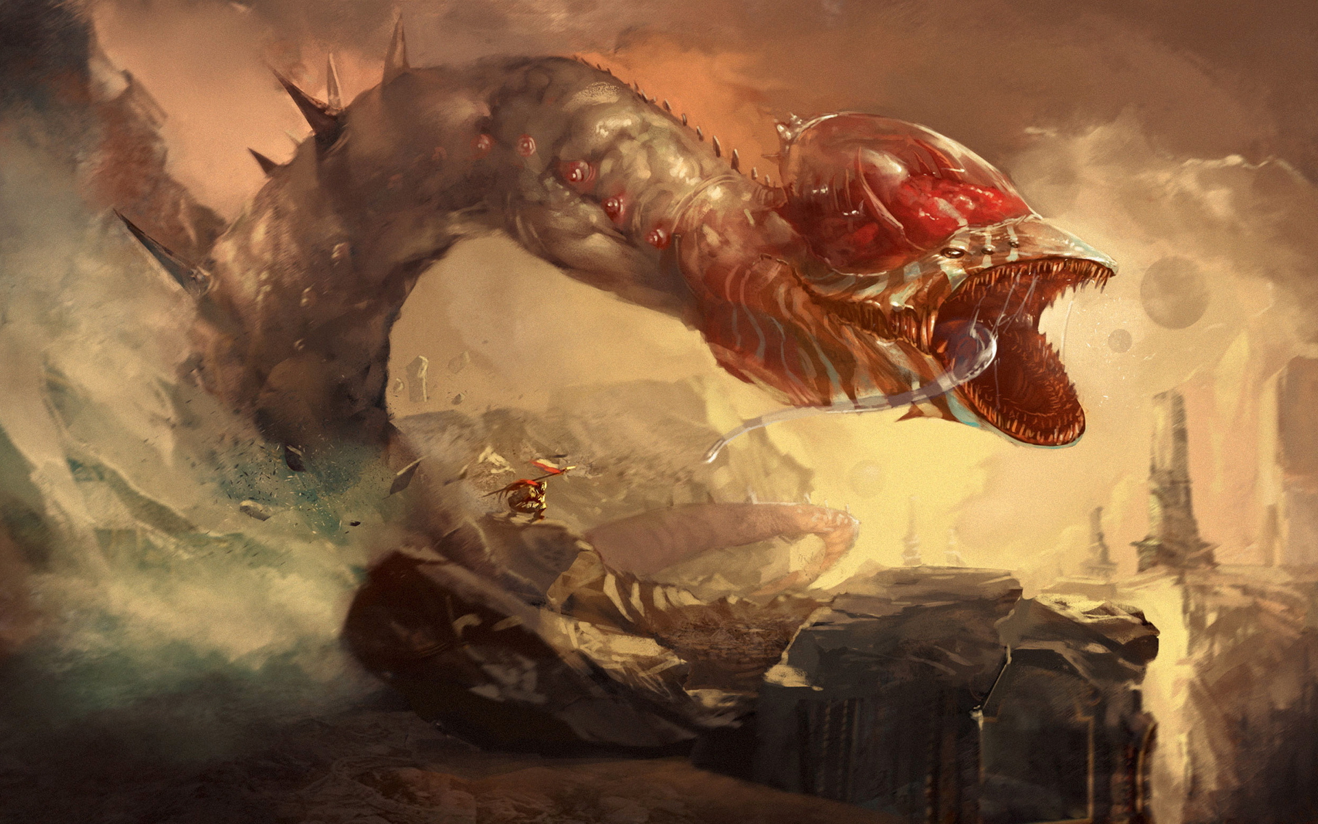 Description: A painting of a giant monster attacking a man in a boat in a river with a giant fish in the water.
