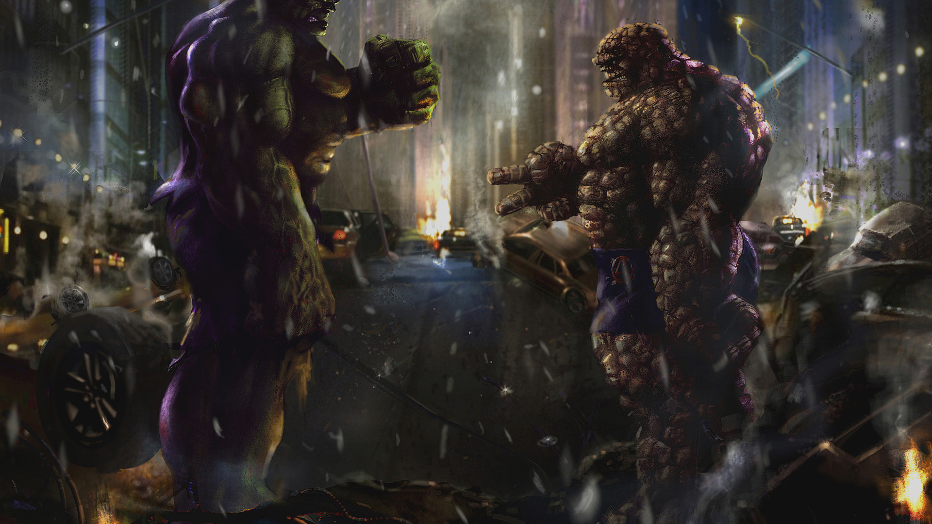 Description: A painting of a man and a giant man in a city street at night with lights on and a fire hydrant in the foreground.
