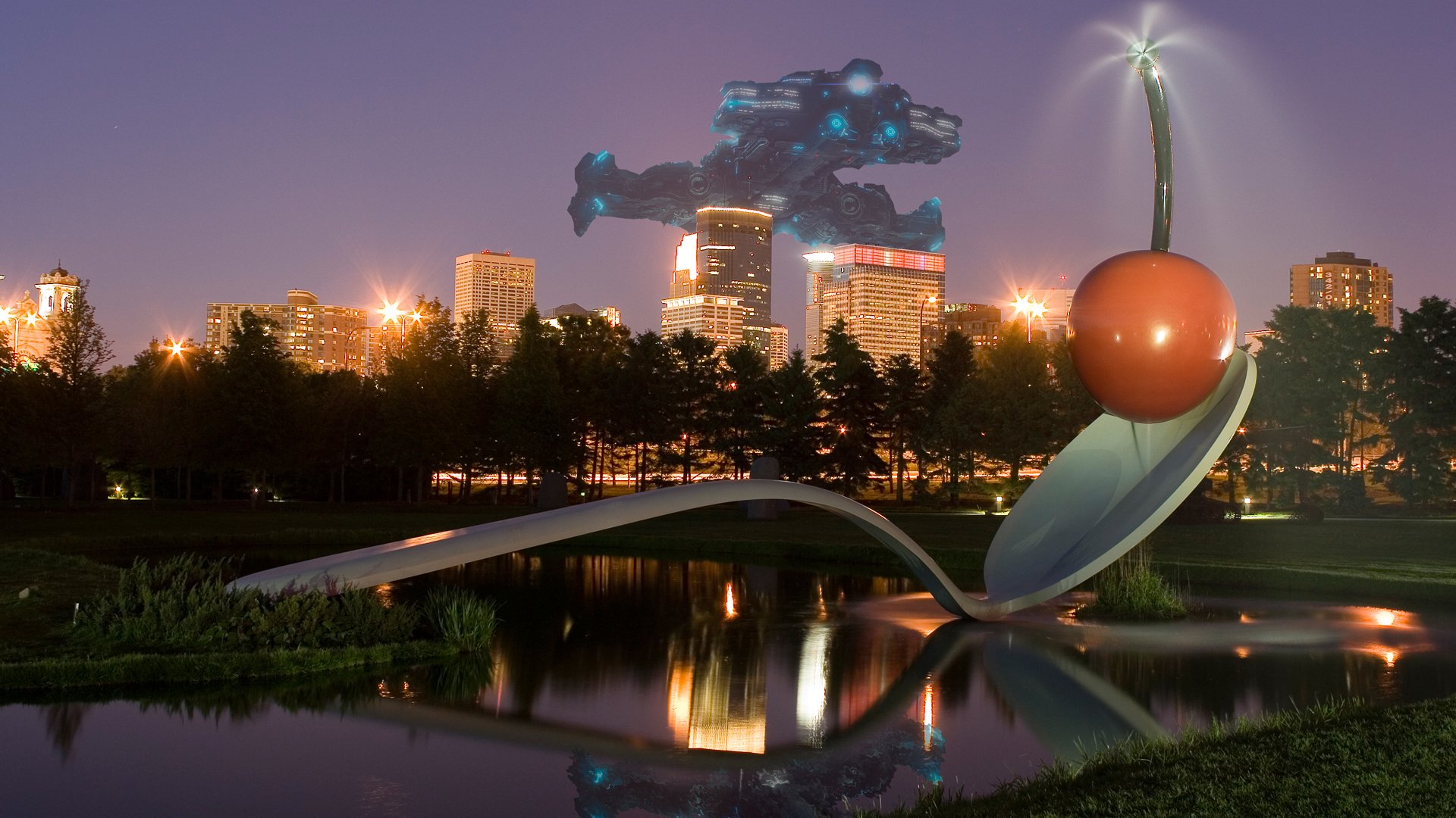 Description: A sculpture of a giant orange ball and a giant metal object in the foreground of a city skyline.