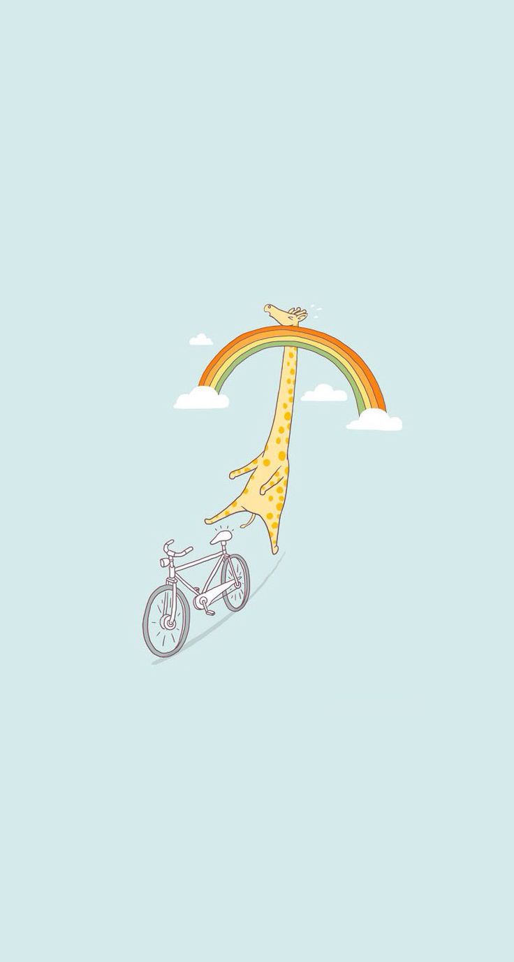 Description: A giraffe riding a bike with a rainbow in the background and a bird flying over it on a blue sky.