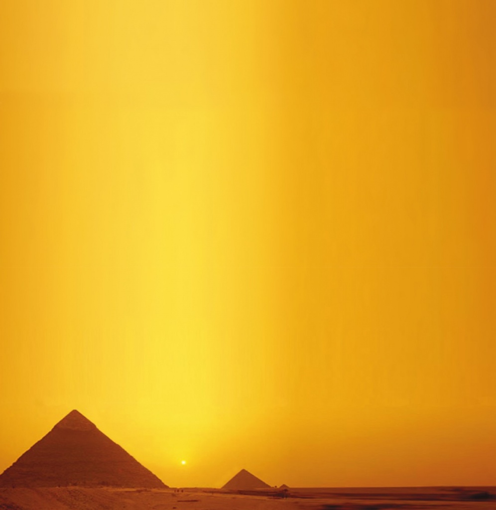 Description: A group of giraffes standing in front of a pyramid in the desert at sunset or sunrise.