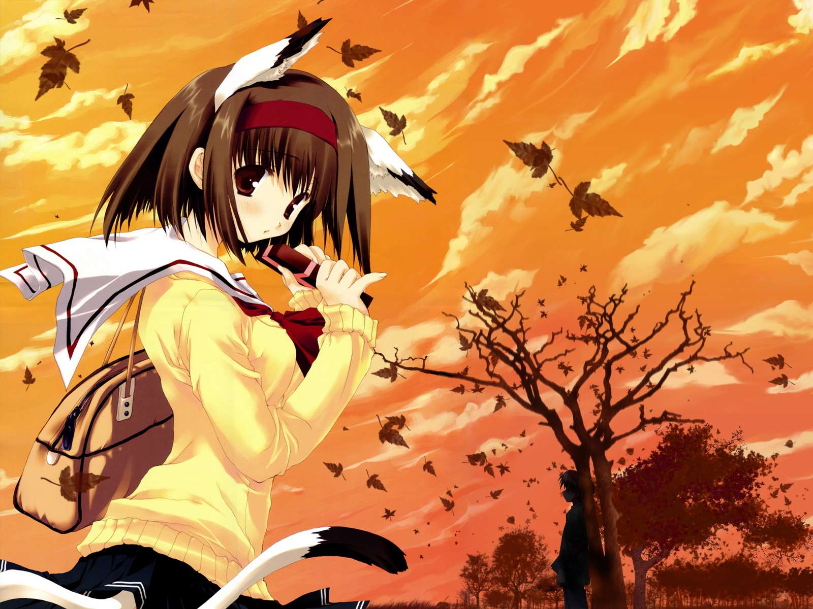 Description: A girl with a backpack and a cat in front of a sunset with birds flying overhead and a tree in the foreground.