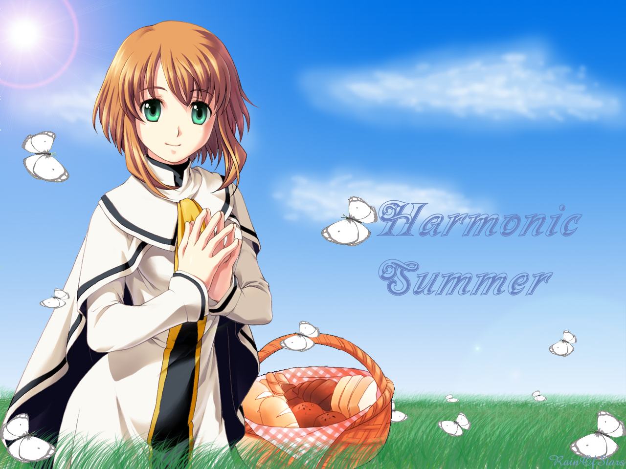 Description: A girl sitting in the grass with a basket of food in front of her and a sky background with clouds.