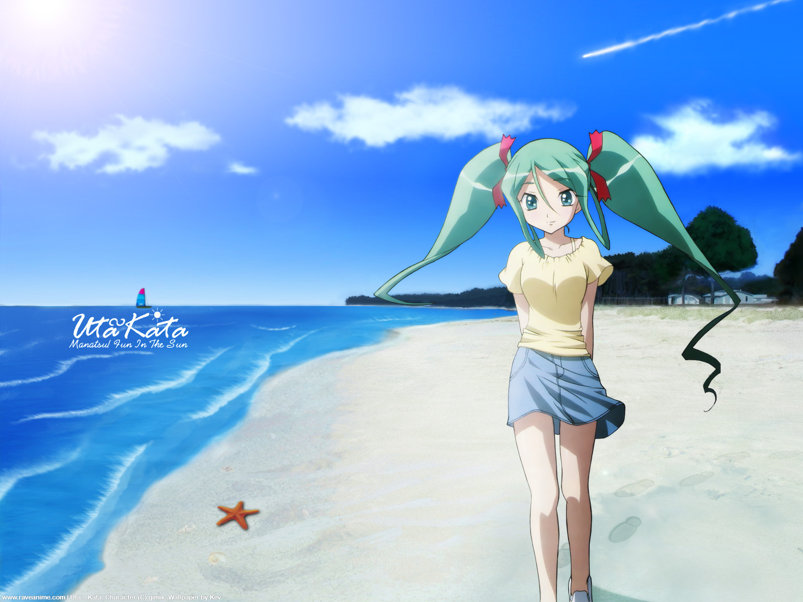 Description: A girl walking on a beach with a starfish in her hand and a blue sky in the background.