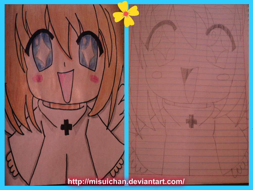 Description: A drawing of a girl with big eyes and a cross on her chest and a drawing of a girl with big eyes.