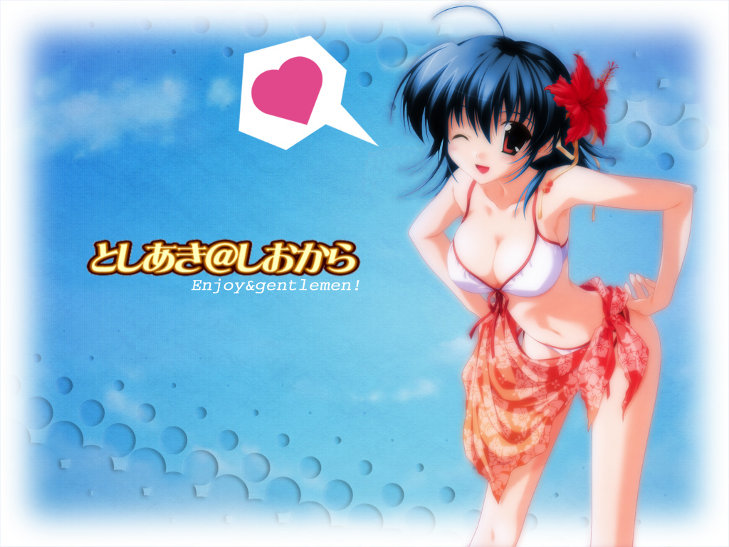 Description: A girl in a bikini with a red flower in her hair and a speech bubble above her head.