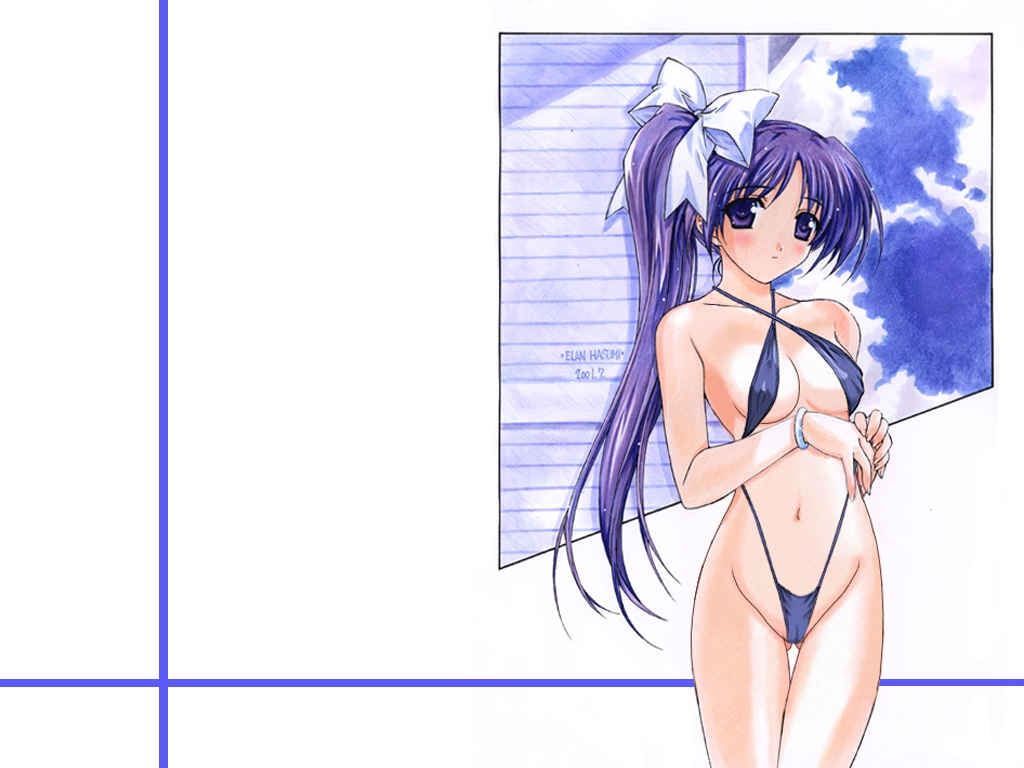 Description: A girl in a bikini standing next to a window with a blue ribbon on her head and a white bow on her head.