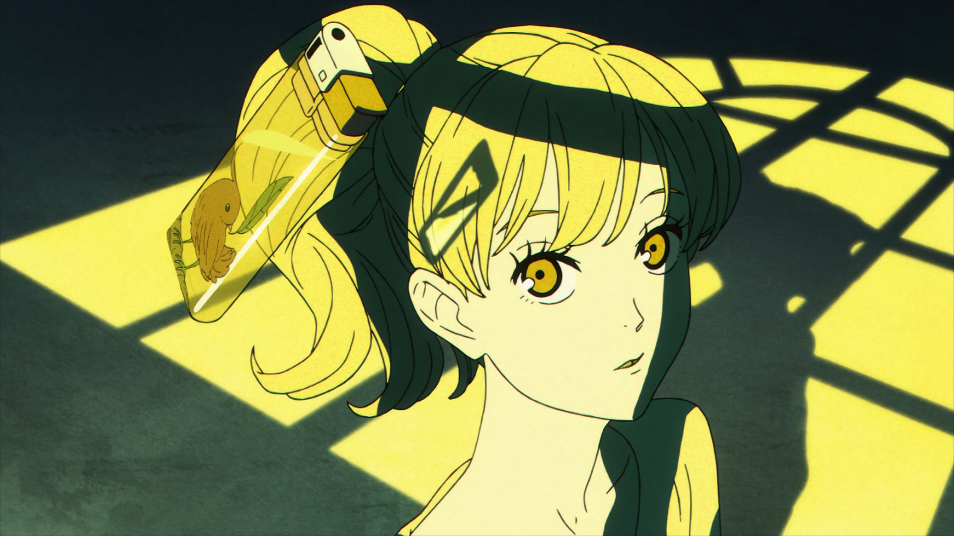 Description: A girl with a bird on her head and a bird on her shoulder.