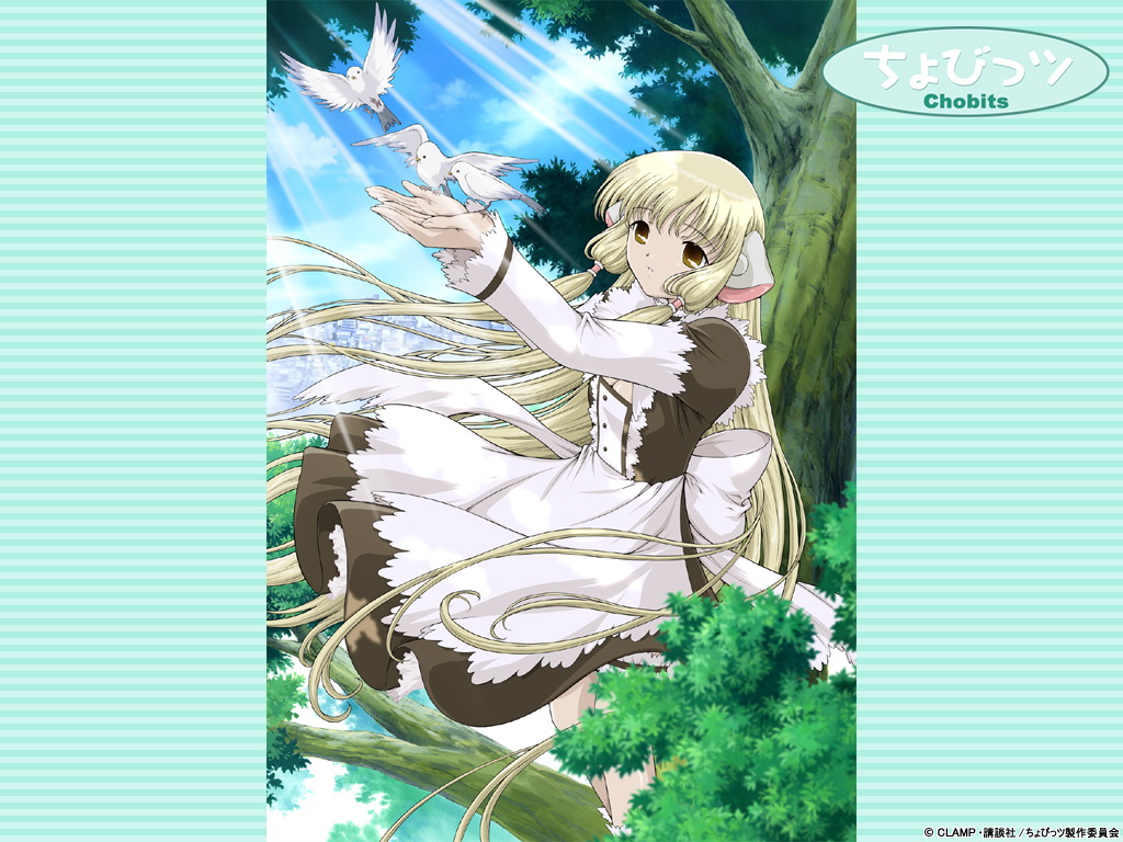 Description: A girl in a white dress and a bird flying over her head in the air.