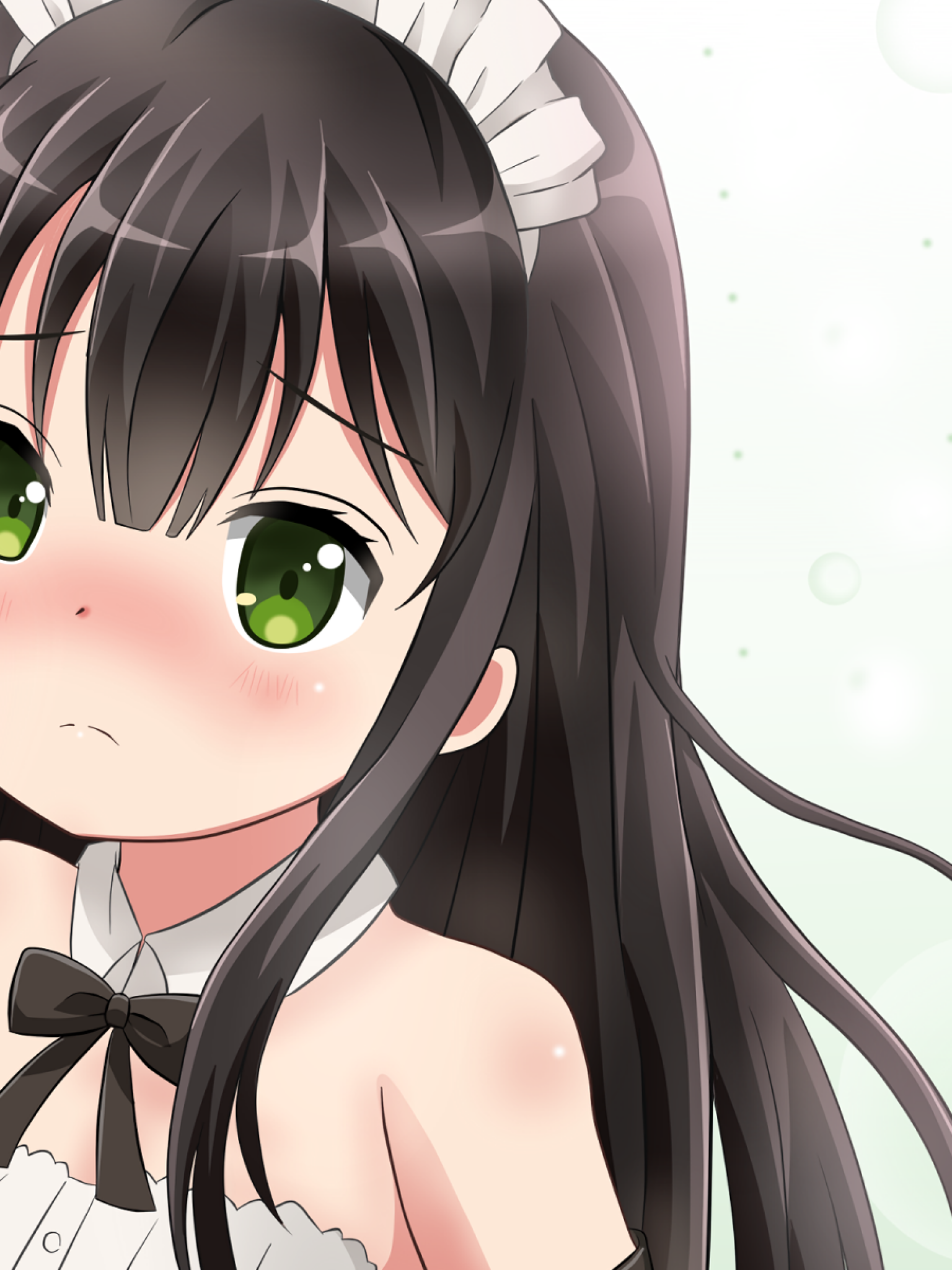 Description: A girl with long black hair and green eyes wearing a white dress and a bow tie and a green eye.
