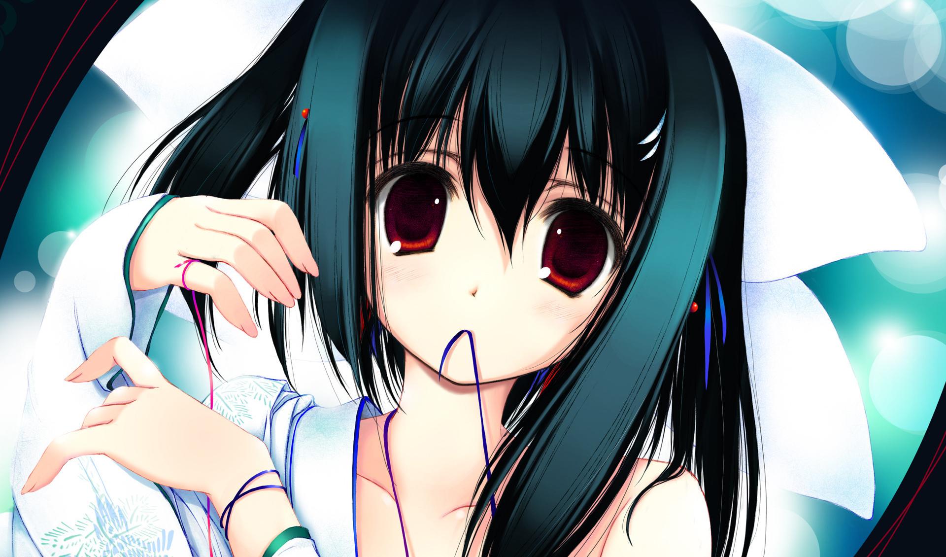 Description: A girl with black hair and red eyes holding a white umbrella in her hand and looking at the camera.